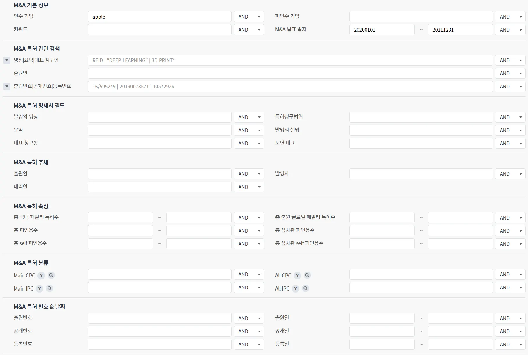 M&A 검색 조건에는 i) M&A 자체의 속성, ii) M&A된 기업이 출원한 특허의 속성 등이 있습니다.