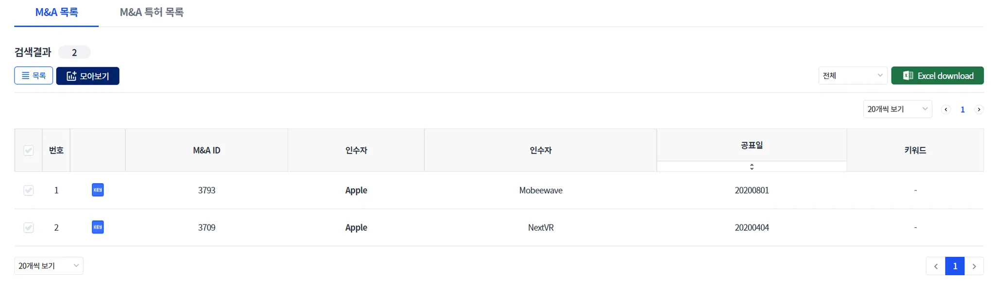 아래는 “목록” 모드로 제공되는 검색 결과 화면입니다. “목록” 모드에서는 “결과 내 검색”이 있어, 검색 조건을 변경할 수 있으며, M&A 리스트도 다운로드 받을 수 있습니다.