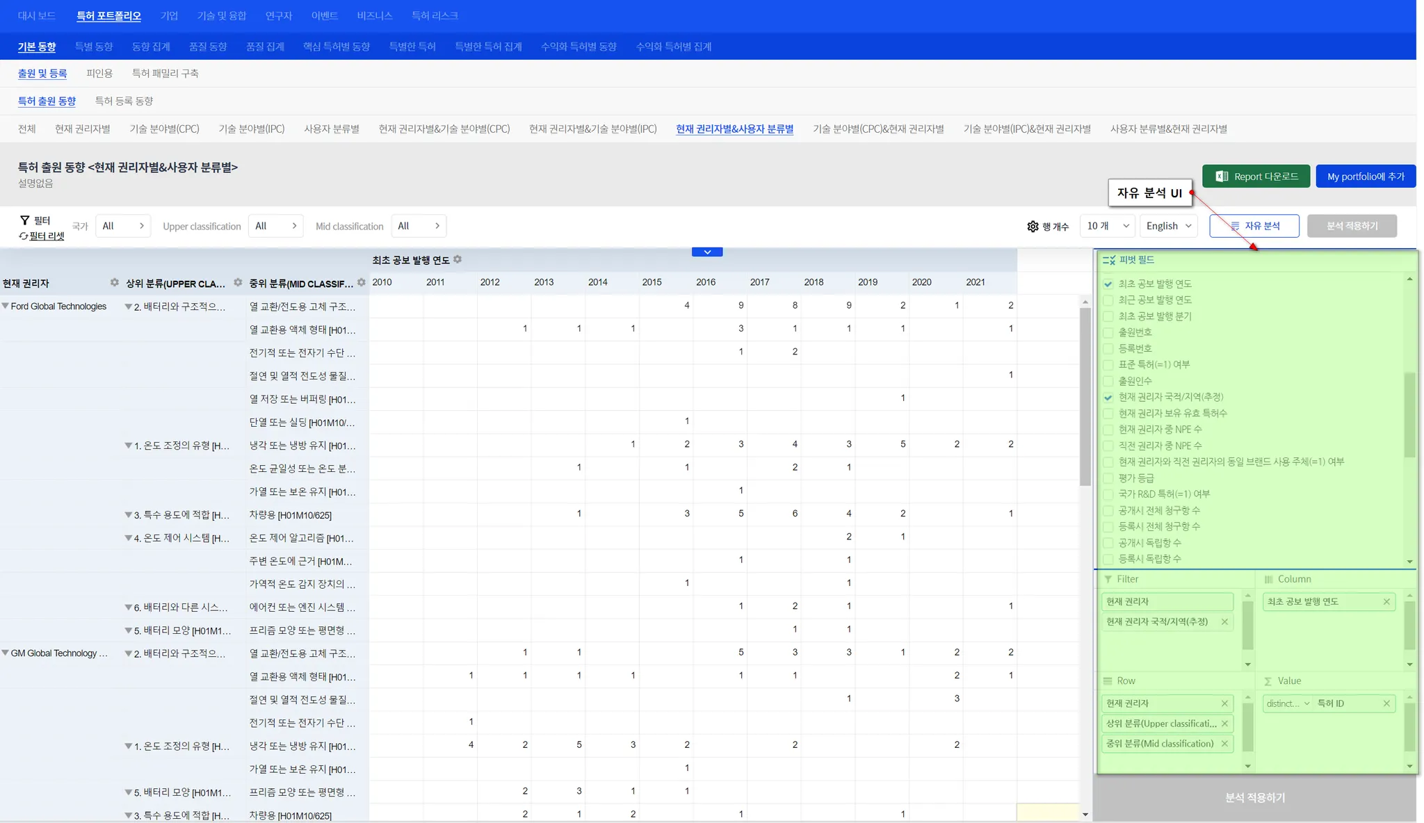 따라서, 주어진 특허셋에 분석 틀/프레임을 구성하는 {행, 열, 값, 필터} 정보를 변경하면, 변경된 특허 분석 결과가 생성됩니다. 자유 분석은 변경된 특허 분석 결과를 생성하기 위하여, {행, 열, 값, 필터} 정보를 변경하는 것입니다.