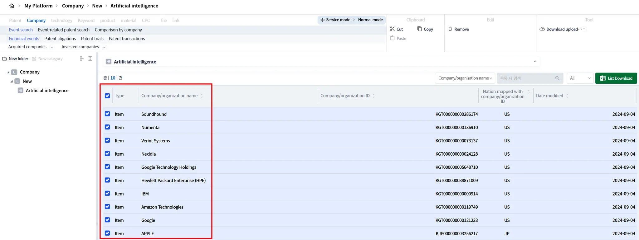 There are four main kinds of thematic company groups offered by PatentPia. They are: i) listed company groups, ii) series of companies that make up the composition of a company group, iii) thematic company groups, and iv) events occurrence company groups. The kinds of company groups for comparison will be continuously expanded. In particular, company groups related to governance, supply chain, ETFs, etc., company groups by various topics/theme/purpose, and companies related to M&A/investments of global market leaders will be provided.