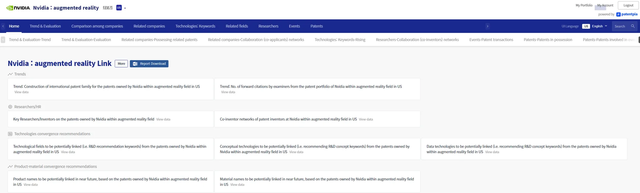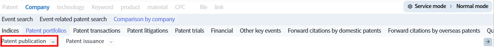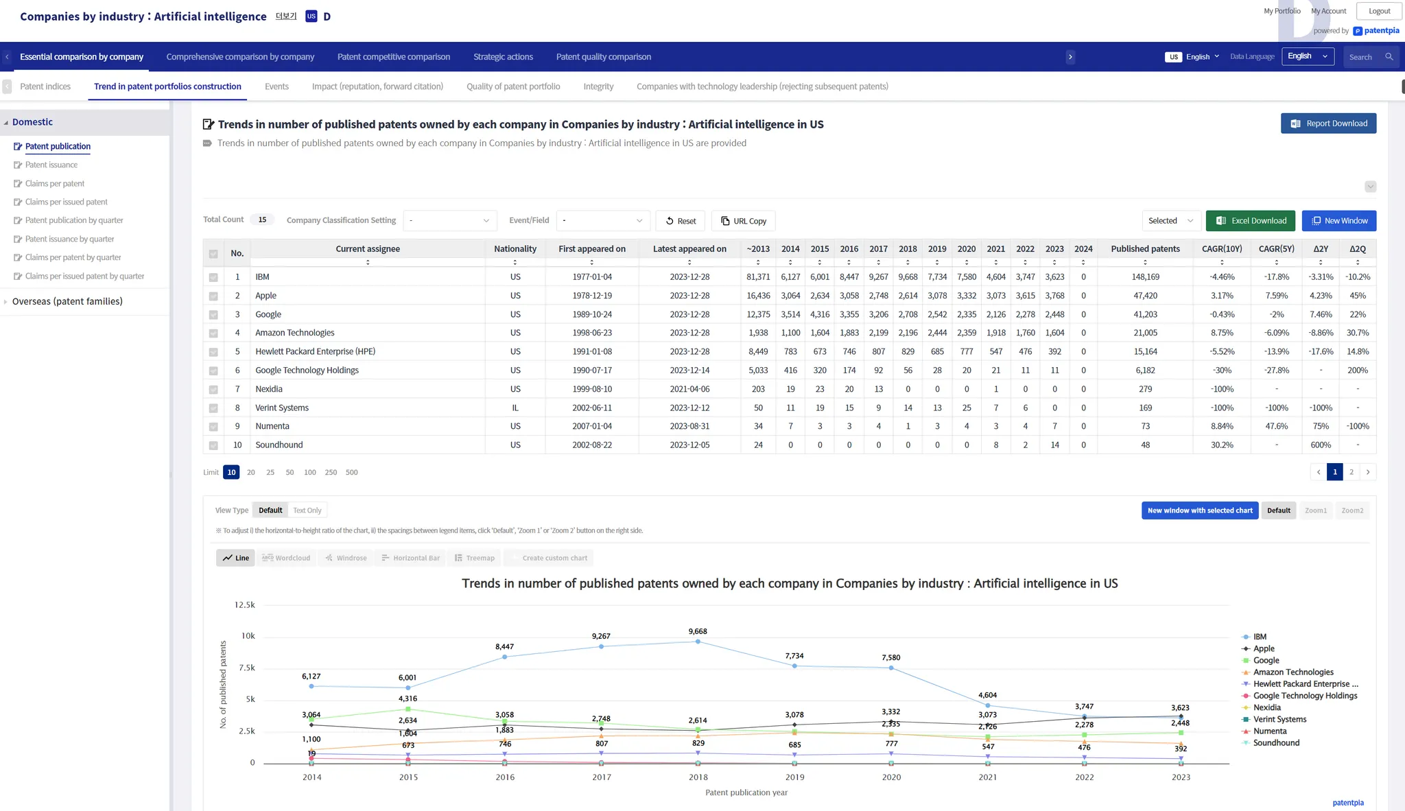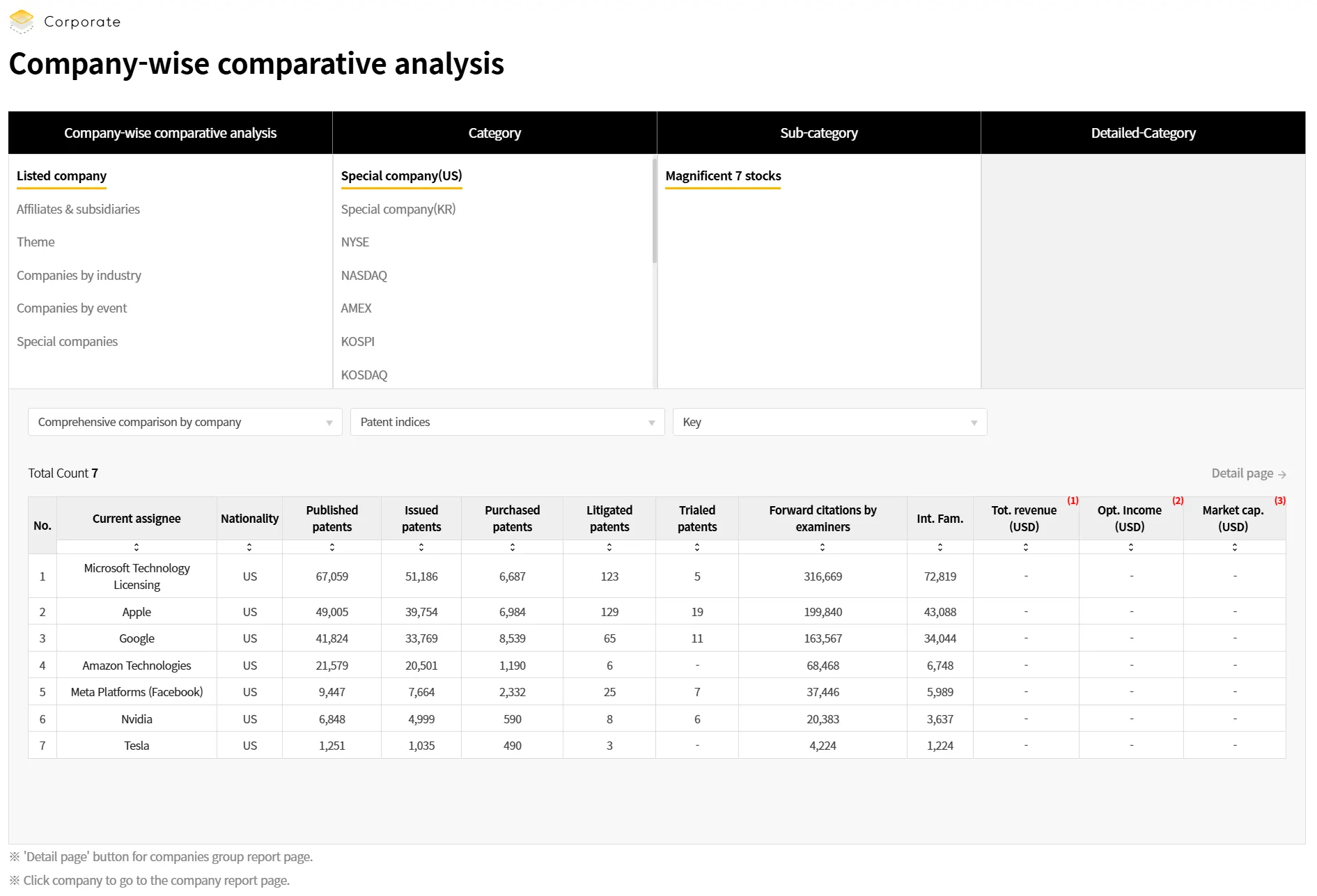 There are two types of comparisons with companies: i) a given set of companies (thematic company groups provided by PatentPia, etc.) and ii) a customized set of companies (uploaded by the user).