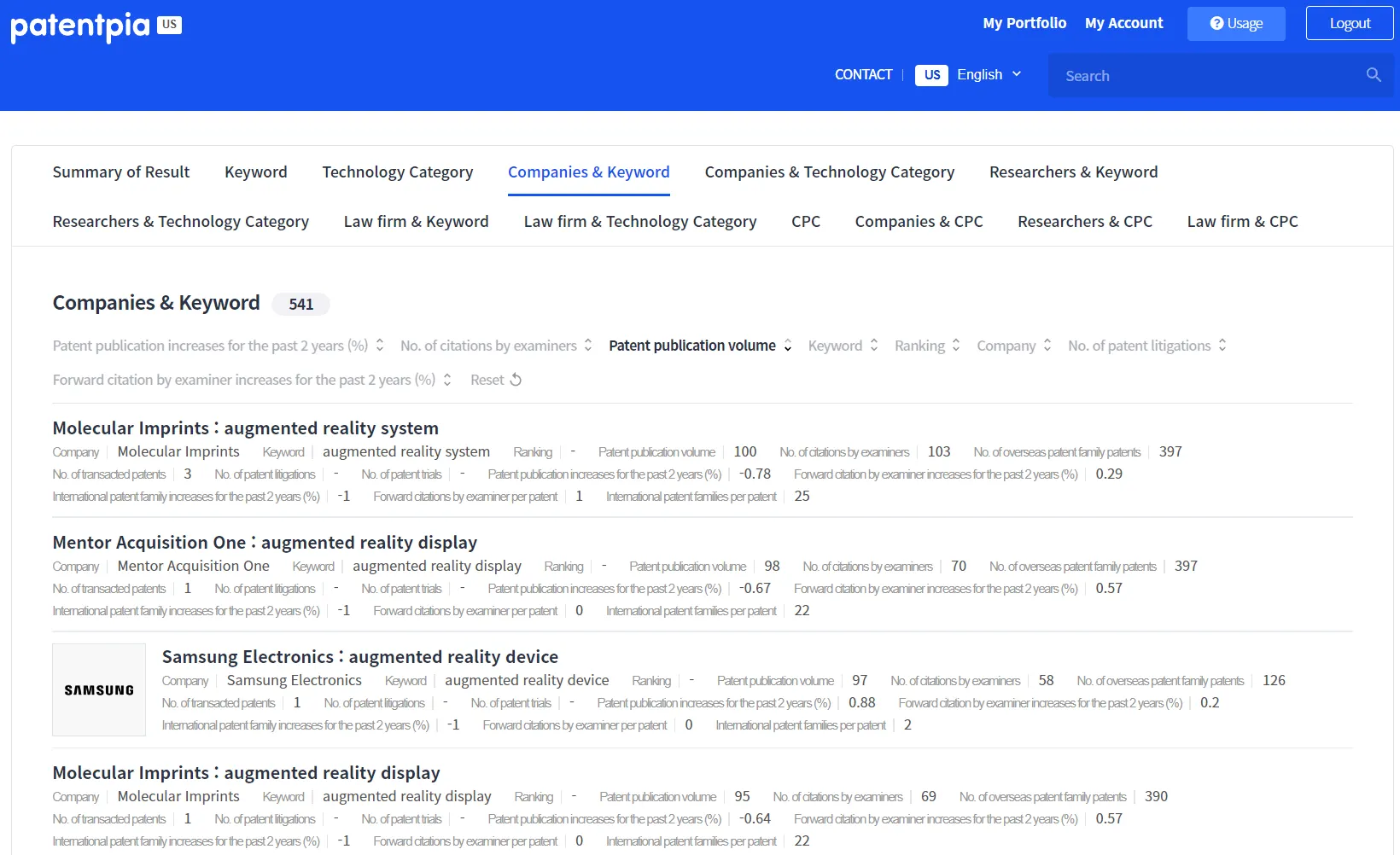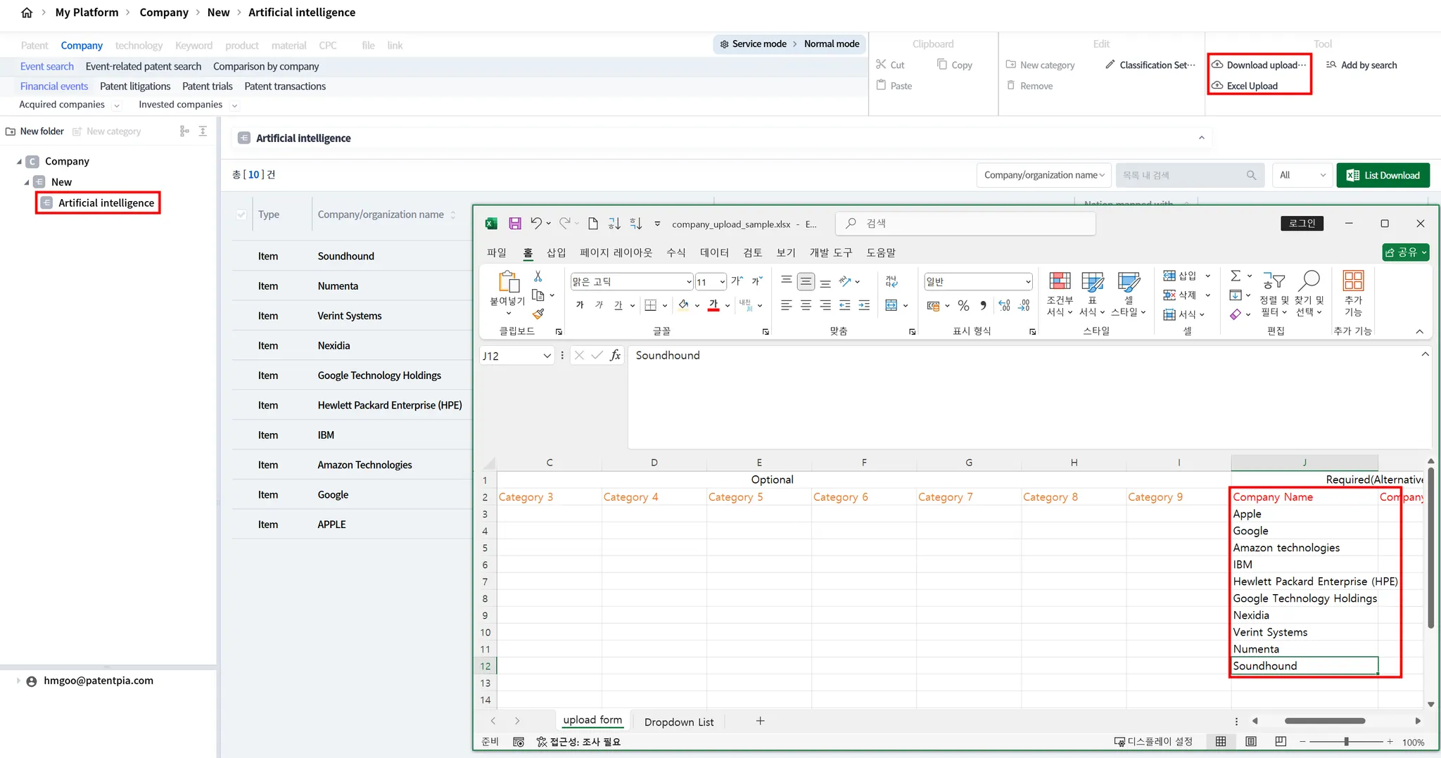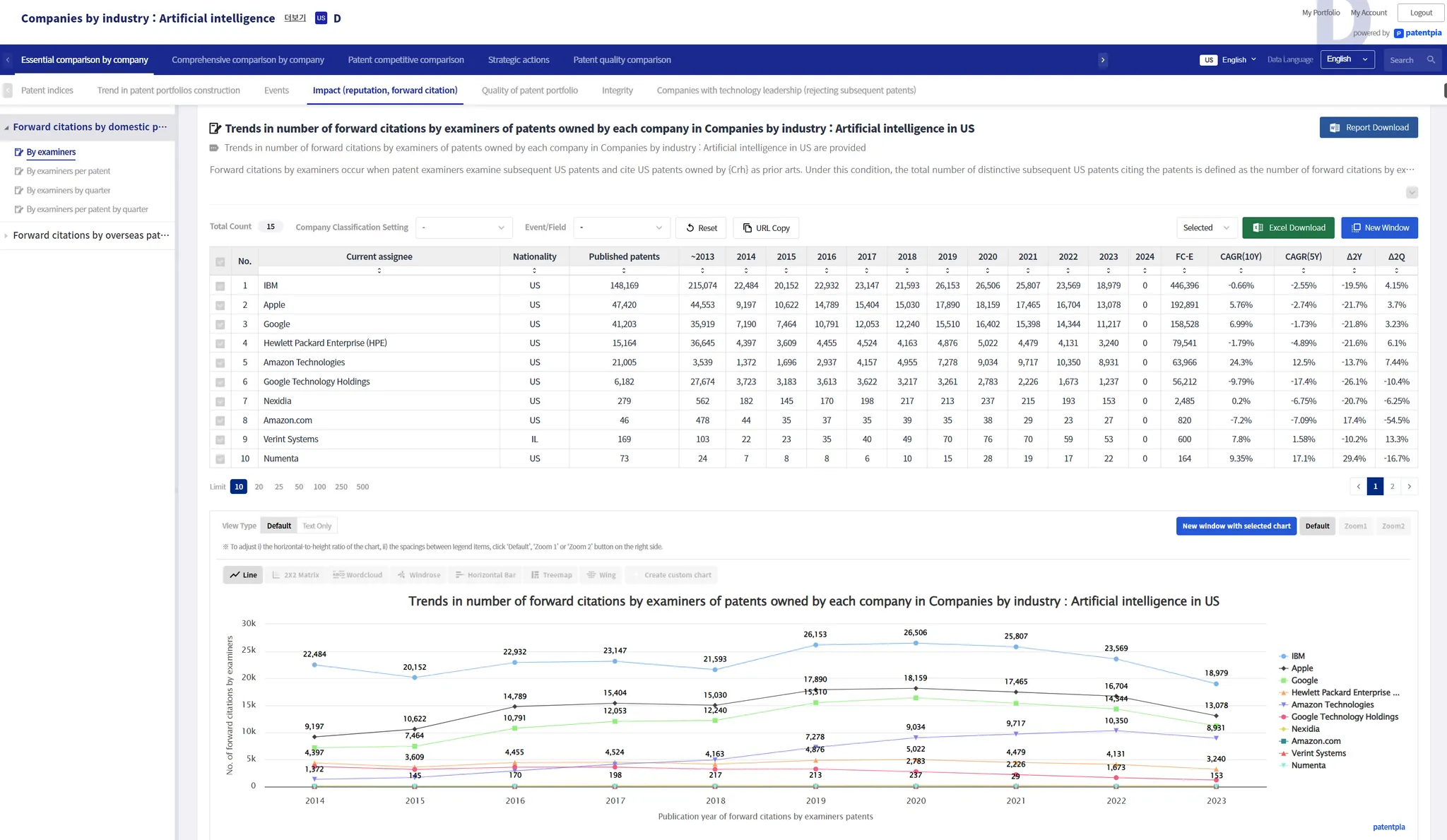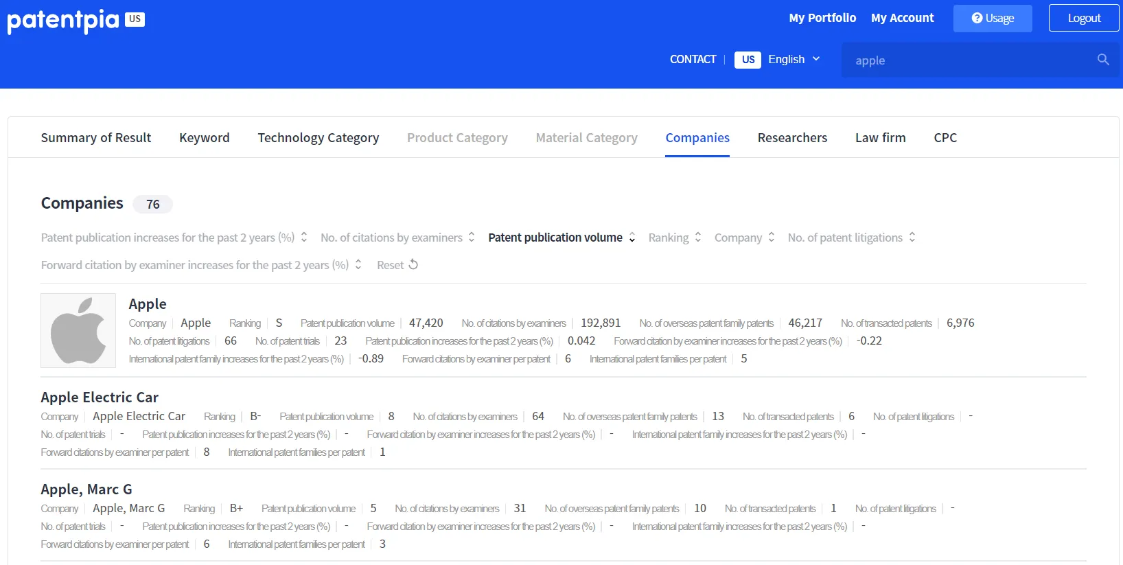 There are two types of comparisons with companies: i) a given set of companies (thematic company groups provided by PatentPia, etc.) and ii) a customized set of companies (uploaded by the user).