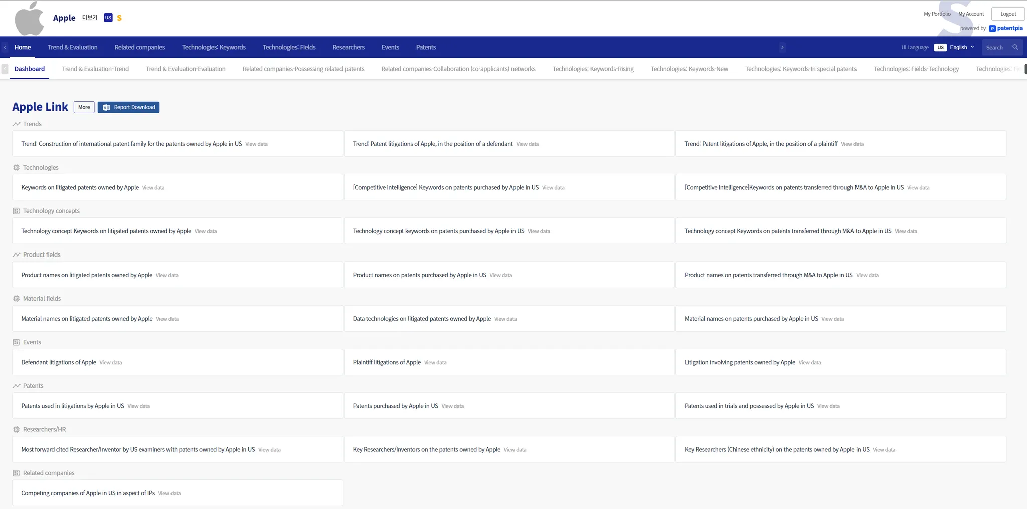 Using Apple as an example, we provide analysis contents for comparison with companies utilizing PatentPia GoldenCompass. If you click on the chain(link) marks that are combined to each item in the above utilization map, the example page will open in a new window.