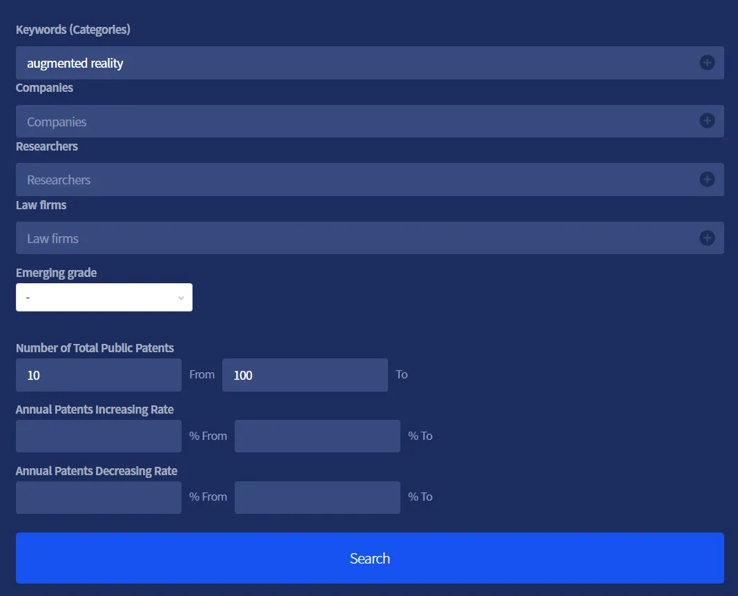 Search for companies with specific attributes/characteristics/conditions. The important thing is that the search term you enter does not have the company name. The attributes/conditions include keywords or metric conditions. For example, search for companies related to blockchain with patent size between 10 and 100.