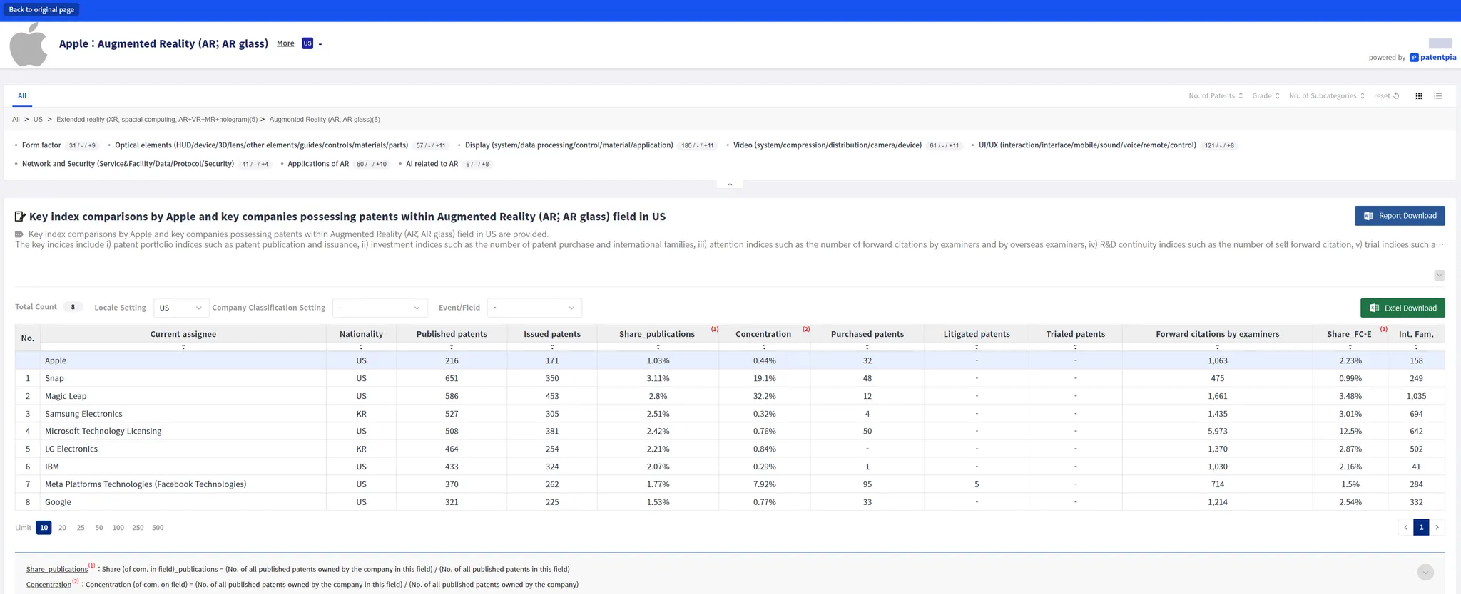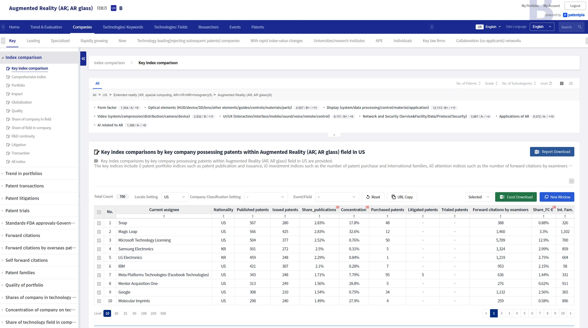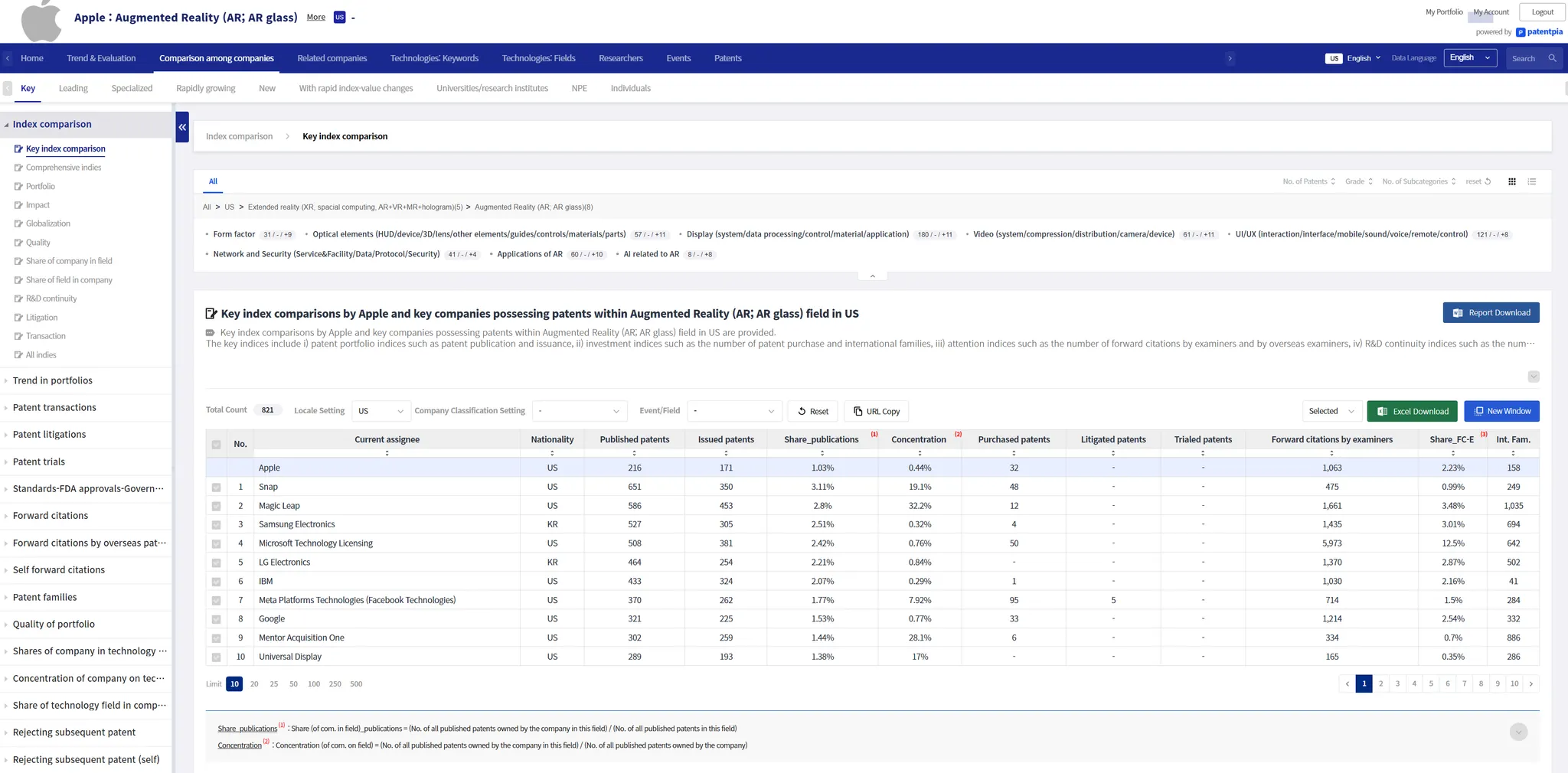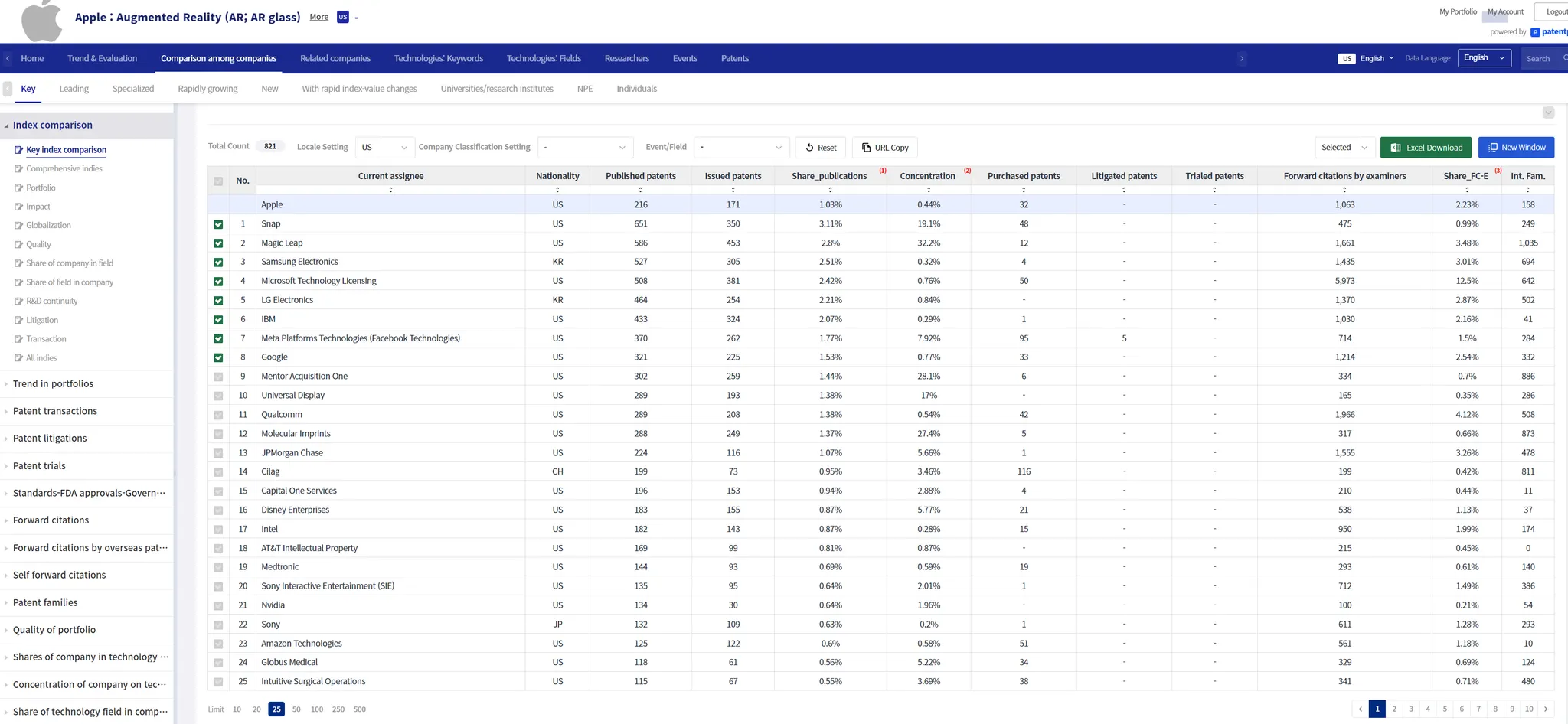 Company i vs. comparison companiesij, comparison analysis metrics include: i) portfolio, ii) impact, iii) globalization, iv) quality, v) share/concentration, vi) R&D continuity, vii) patent transactions (purchased), viii) litigation, vx) trials, and x) standards/FDA approvals/government-funded R&D. Note that share and concentration are valid metrics only when the field is specific.
