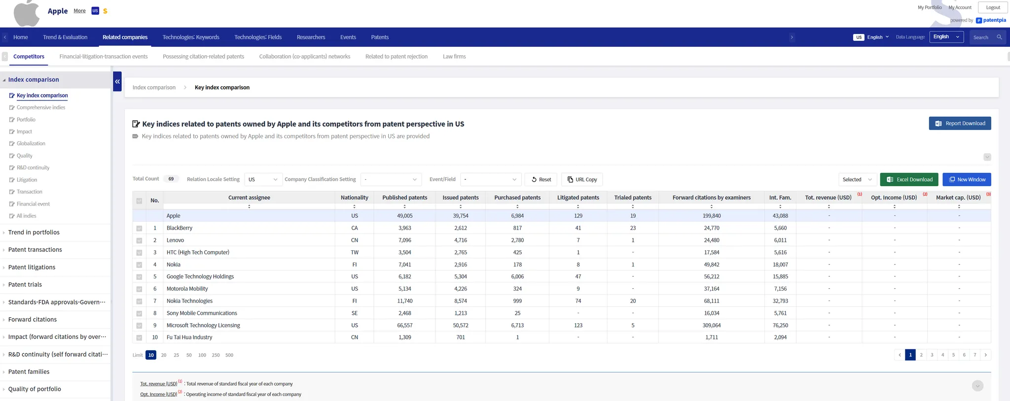 comparison analysis contents topics include: i) portfolio, ii) impact, iii) globalization, iv) quality, v) share, vi) R&D continuity, vii) patent transactions (purchased), viii) litigation, vx) trials, and x) standards/FDA approvals/government-funded R&D.