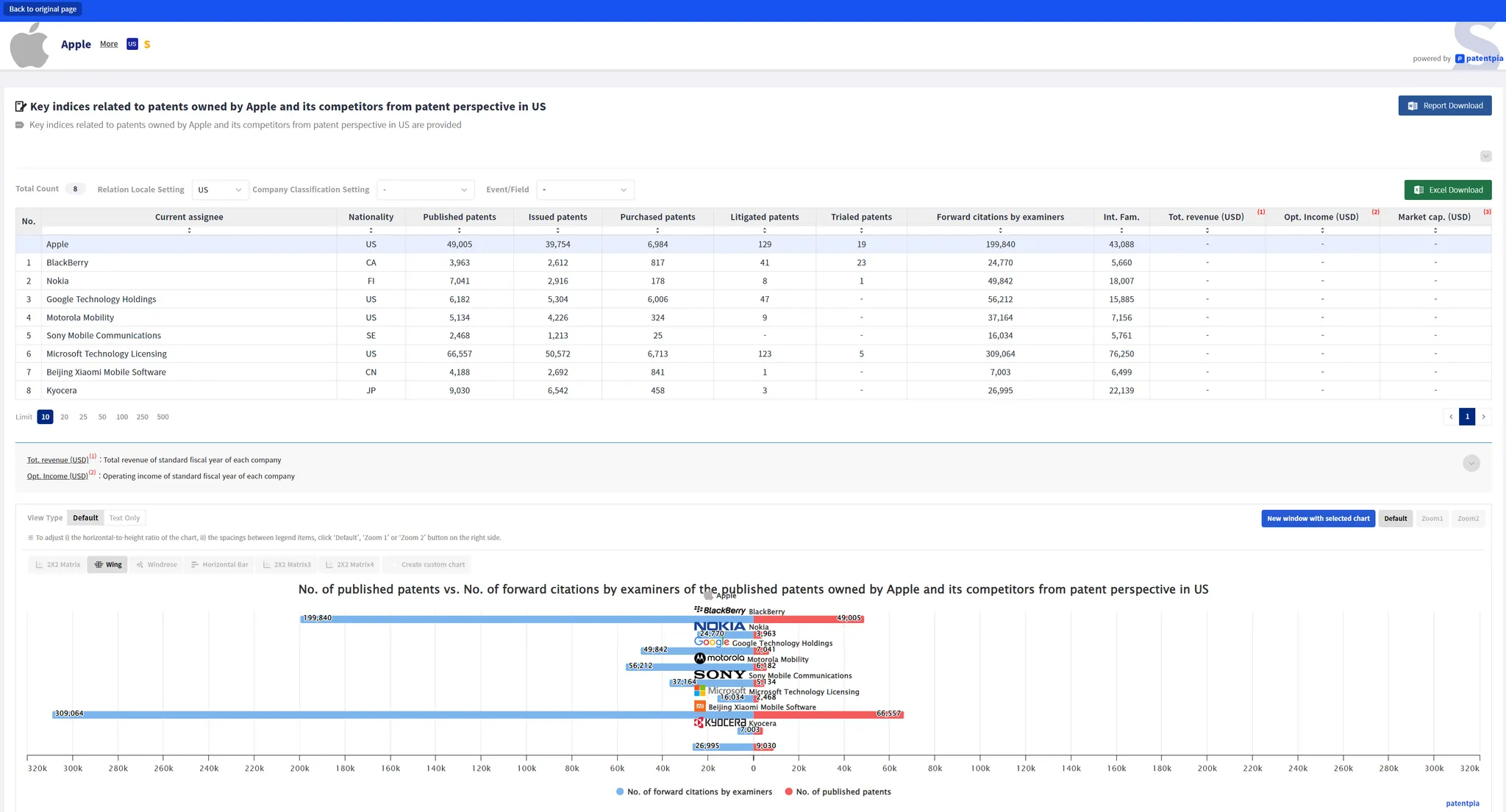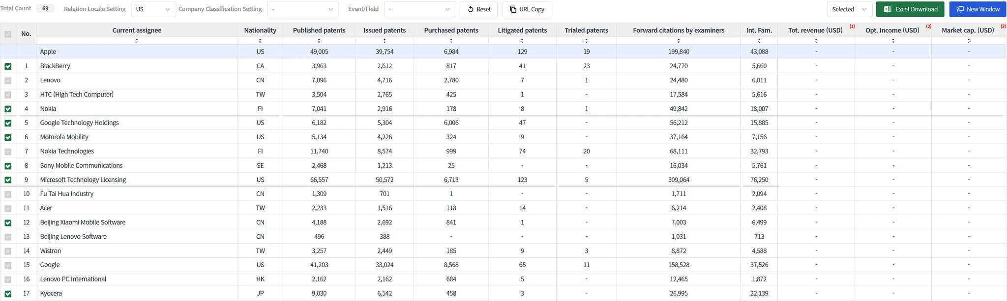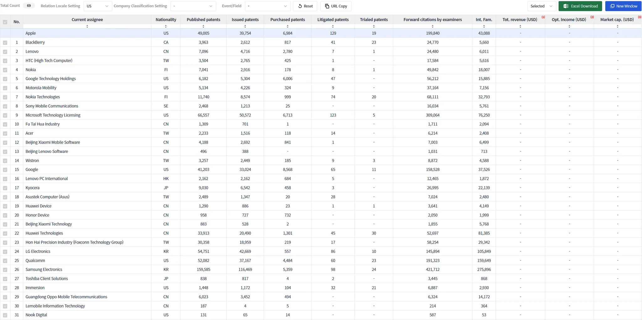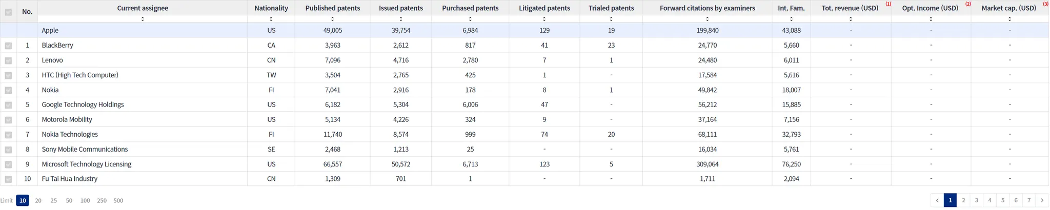 For example, in the list below, Google Technology Holding and Microsoft Technology Holding are not a mobile-specialized company; therefore, the comparison with Apple may be different.