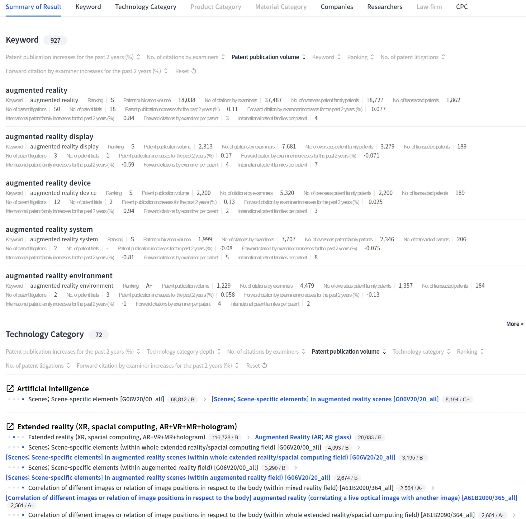 The Search Results tab is composed of i) Summary, ii) Single item series, and iii) Compound item series. Single item series include i) Keywords, ii) Technology field, iii) Products-Parts field, iv) Products-Materials field, v) Patent classification (CPC, etc.), vi) Companies, vii) Researchers, vii) Representative patent (law firm), etc. A compound item series consists of a combination of two single items.