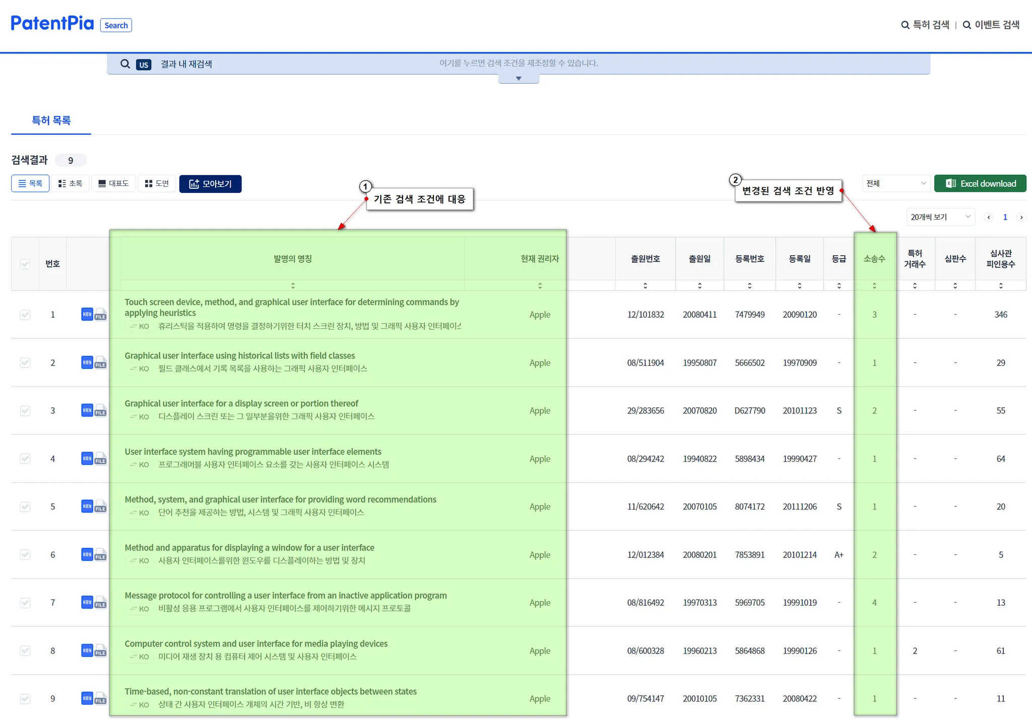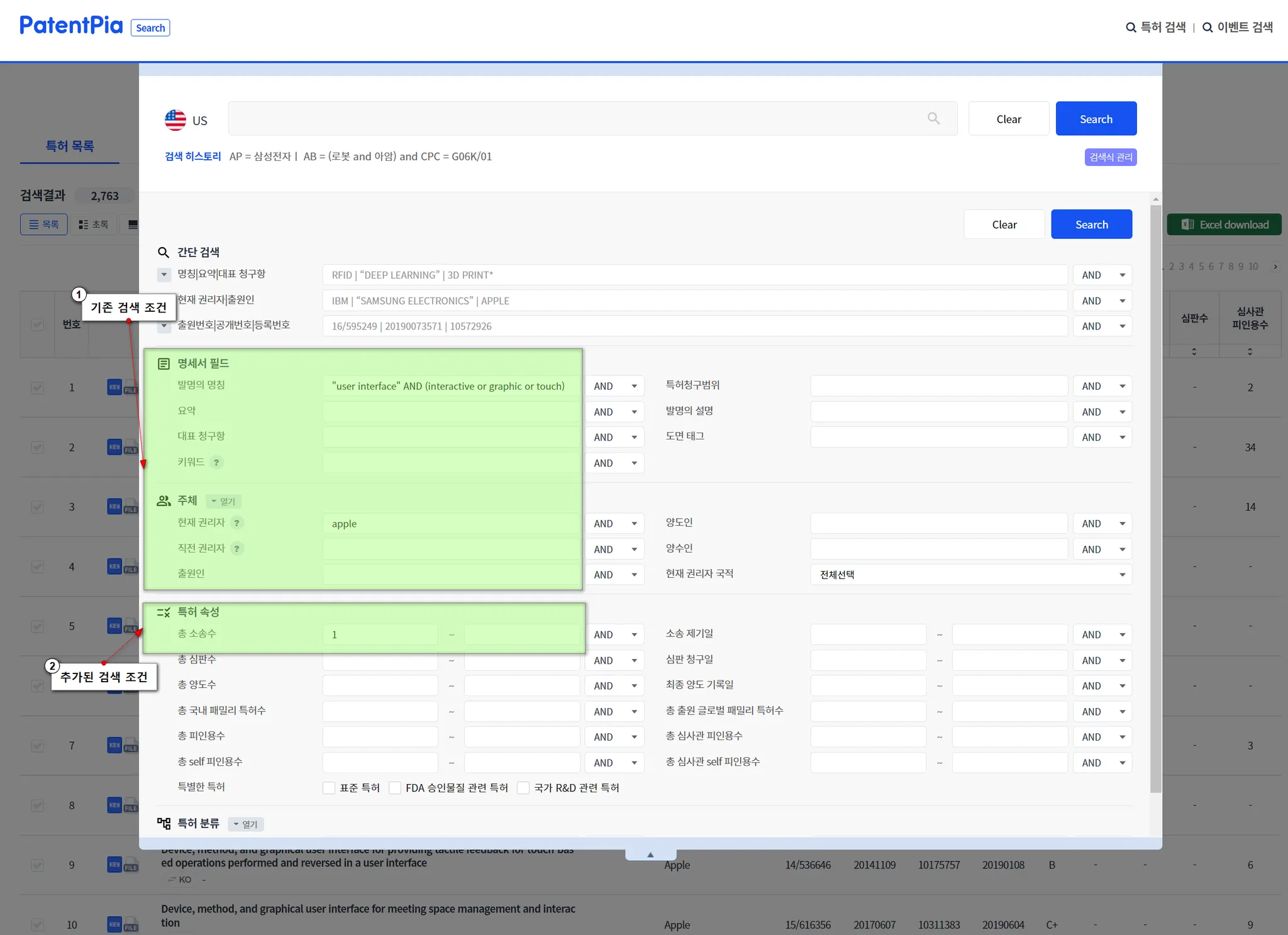 기존 검색 조건에 더하여, “소송수”가 “1 이상”인 특허만이 검색되는 것과 같이, 변경된 검색 조건에 대응된 검색 결과가 생성됩니다.