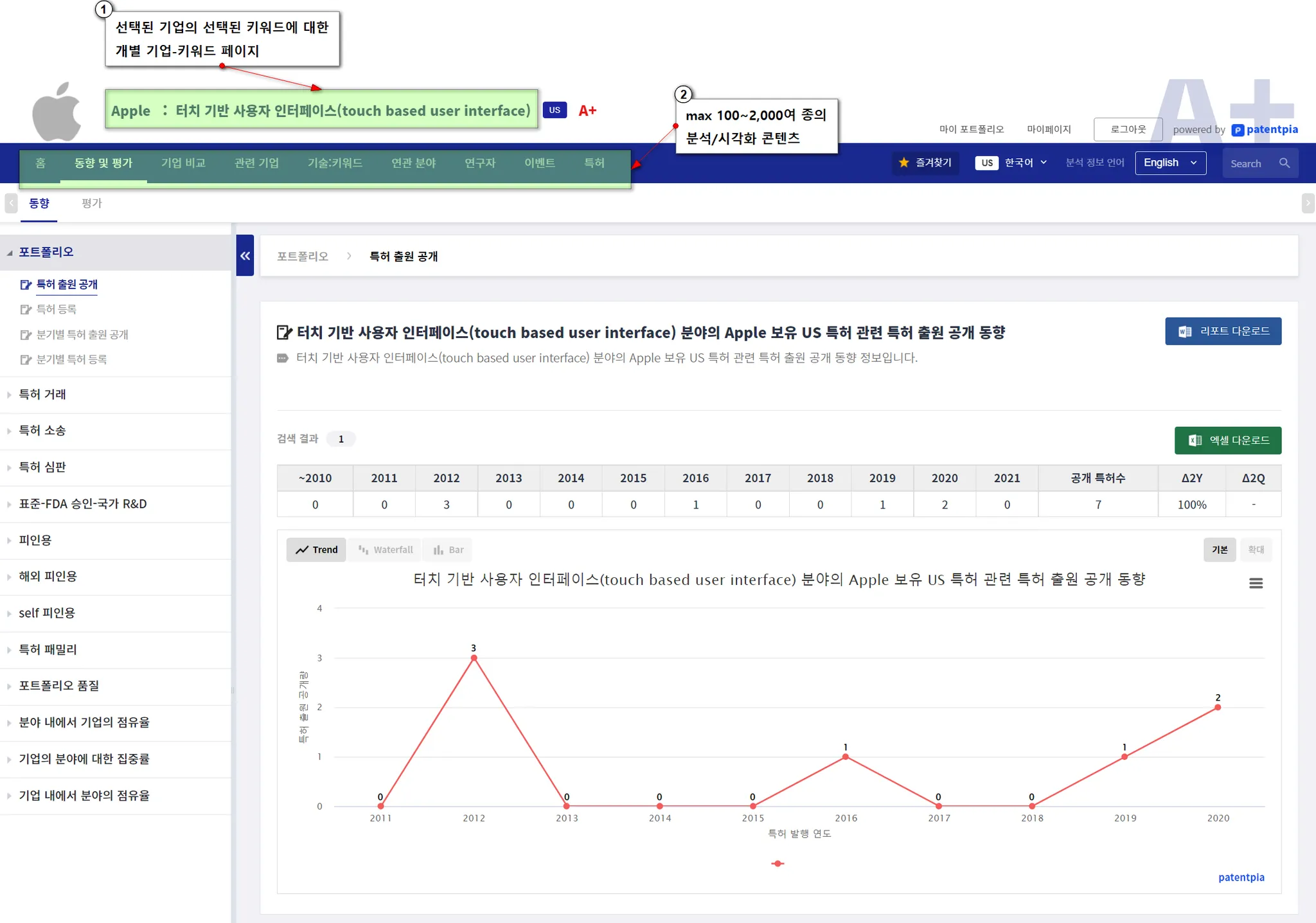 그리고, “터치 기반 사용자 인터페이스”을 클릭했을 때에는, 아래와 같은 “Apple”의 “touch based user interface” 페이지로 연결됩니다. GoldenCompass가 제공하는 “Apple”의 “touch based user interface” 페이지에서는 “Apple”의 “touch based user interface” 키워드에 대한 max 100~2,000여 항목의 분석/시각화 콘텐츠가 제공됩니다.