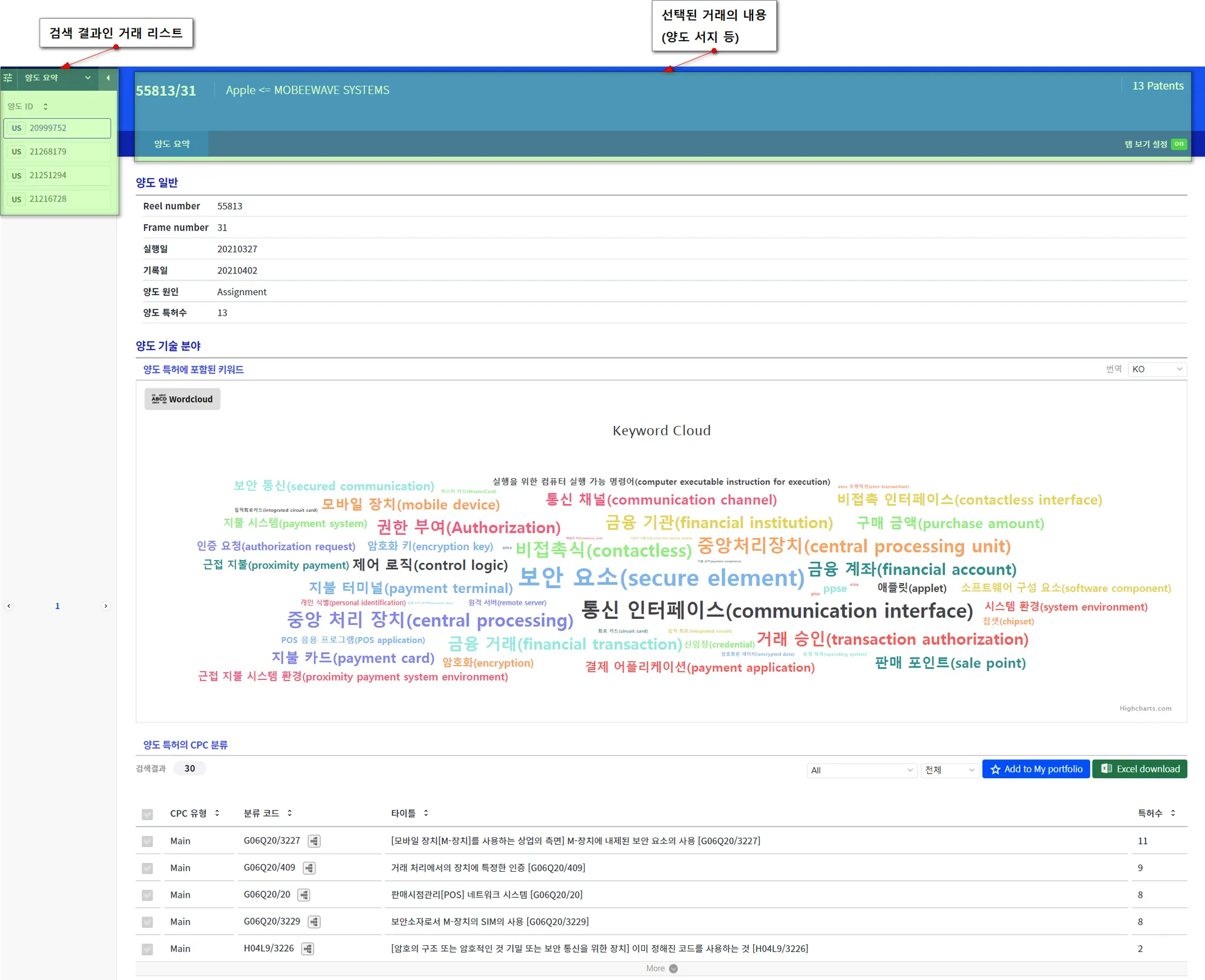 아래는 “거래 자체의 속성”과 “거래 특허의 속성”을 함께 활용하여 거래를 검색하는 예시입니다. “Apple”이 2021년에 무선 통신(CPC/IPC = H04W) 분야의 특허를 매입한 특허 거래를 검색합니다.