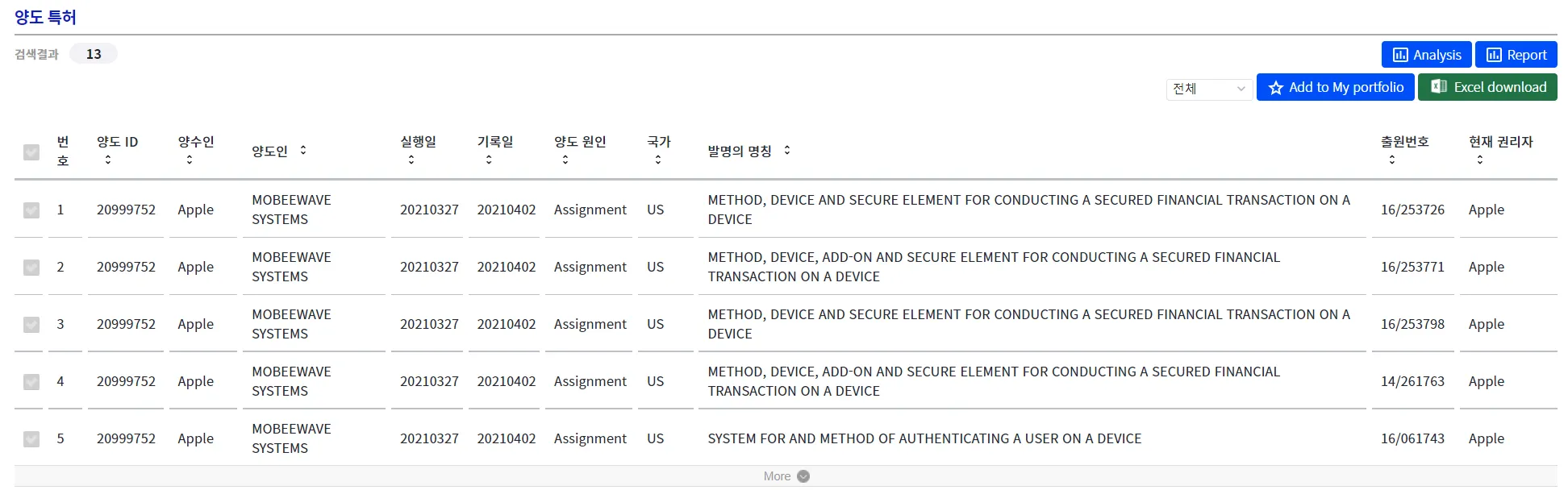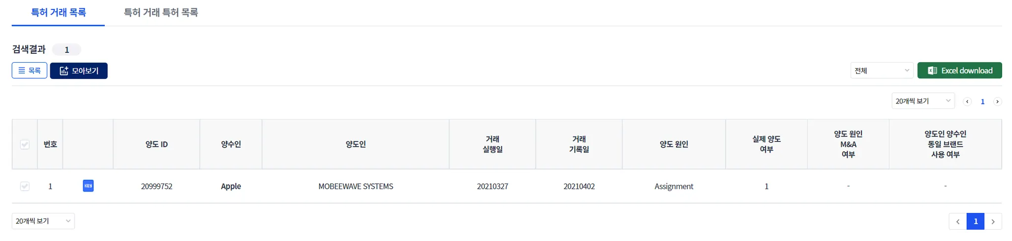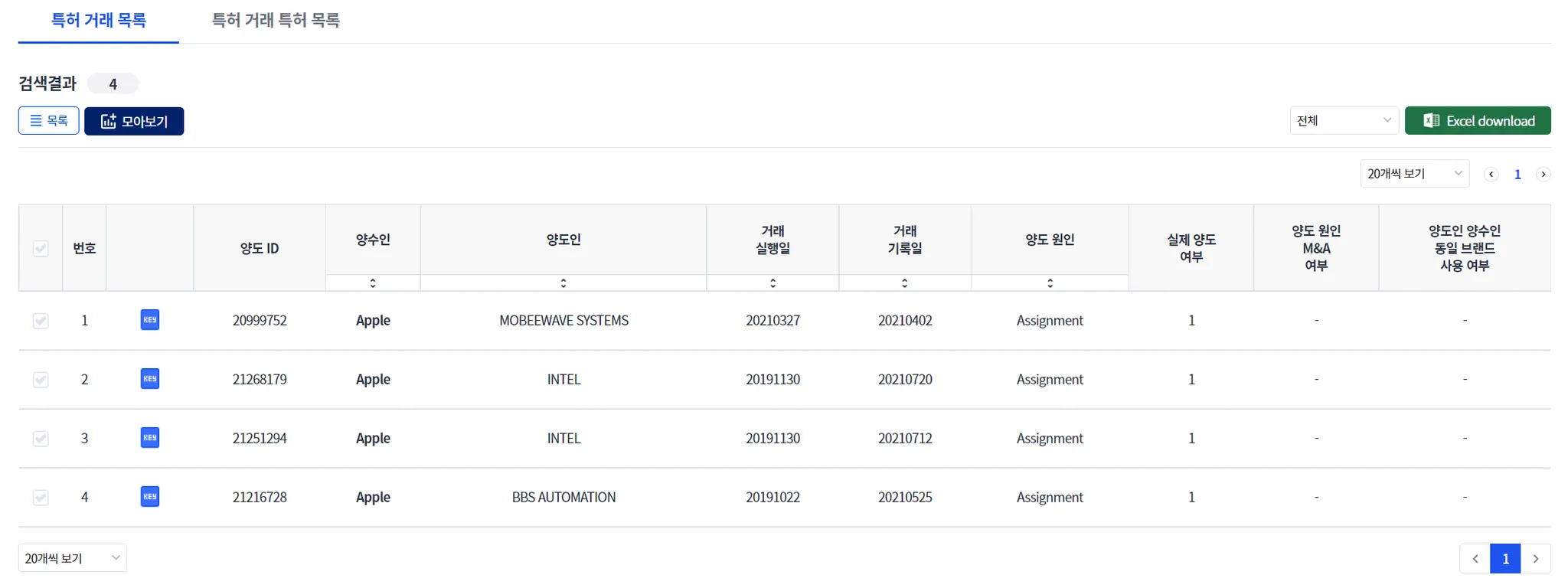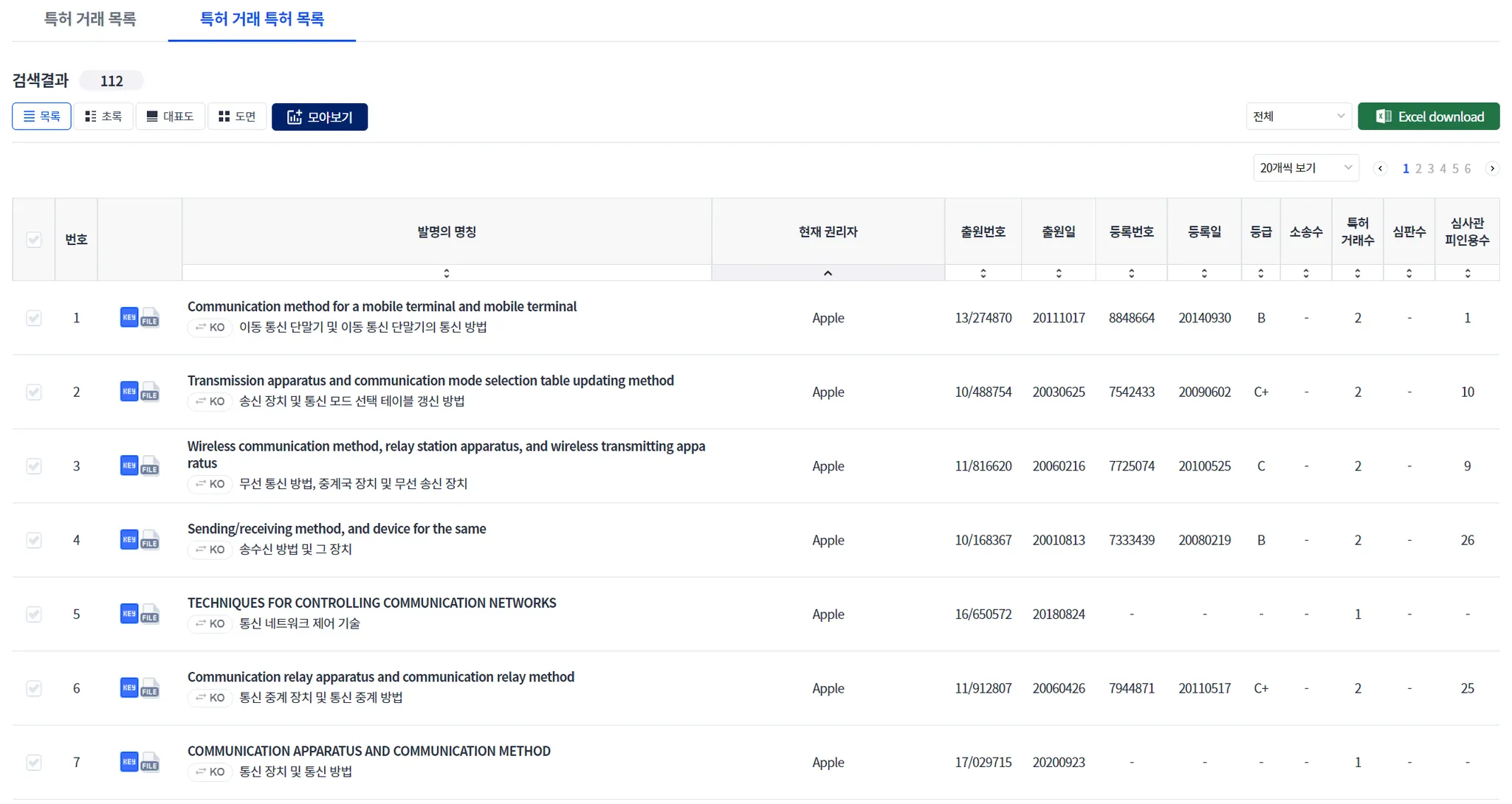 “거래 특허 목록”을 클릭하면, 검색된 1개 이상의 거래에서 거래된 특허를 모아서 출력해 줍니다.