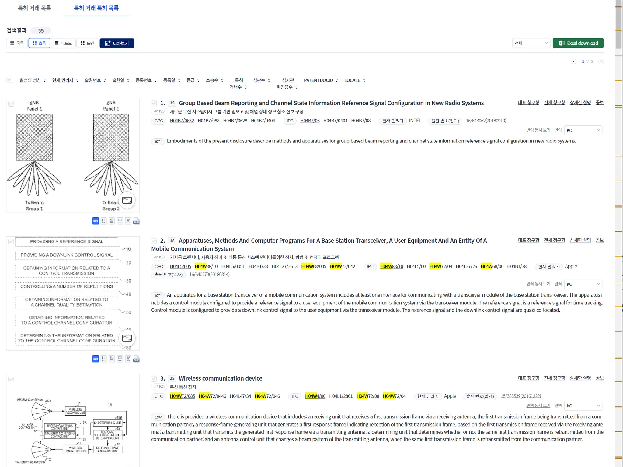 위 검색 결과에서, “특허 거래 특허 목록” 모드를 클릭하면, 거래된 특허 리스트가 나타납니다. “초록” 보기 모드를 클릭합니다. 이어, 찾기(ctrl+F)를 한 다음에, “H04W”를 입력하면, “H04W”가 하일라이트된 다음과 같은 화면이 됩니다.