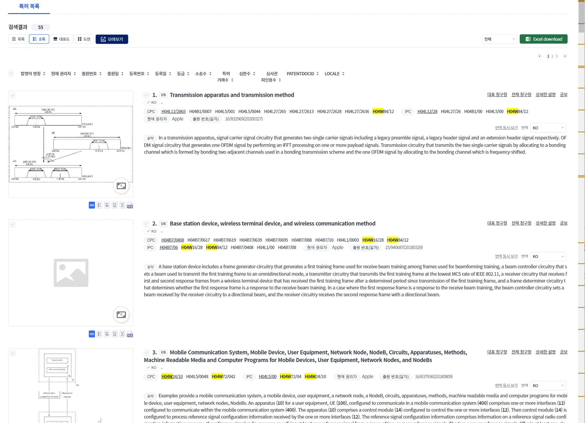 이와 같이 검색하면, 특허 리스트가 나타납니다. “초록” 보기 모드를 클릭합니다. 이어, 찾기(ctrl+F)를 한 다음에, “H04W”를 입력하면, “H04W”가 하일라이트된 다음과 같은 화면이 됩니다. 모든 특허의 CPC에서 H04W가 포함되어 있음을 알 수 있습니다.