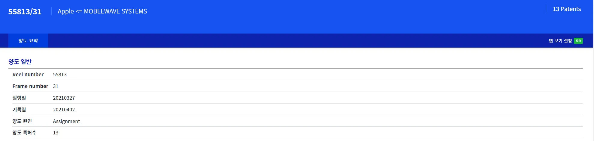 거래 서지 페이지에서는 거래된 특허가 제공됩니다.