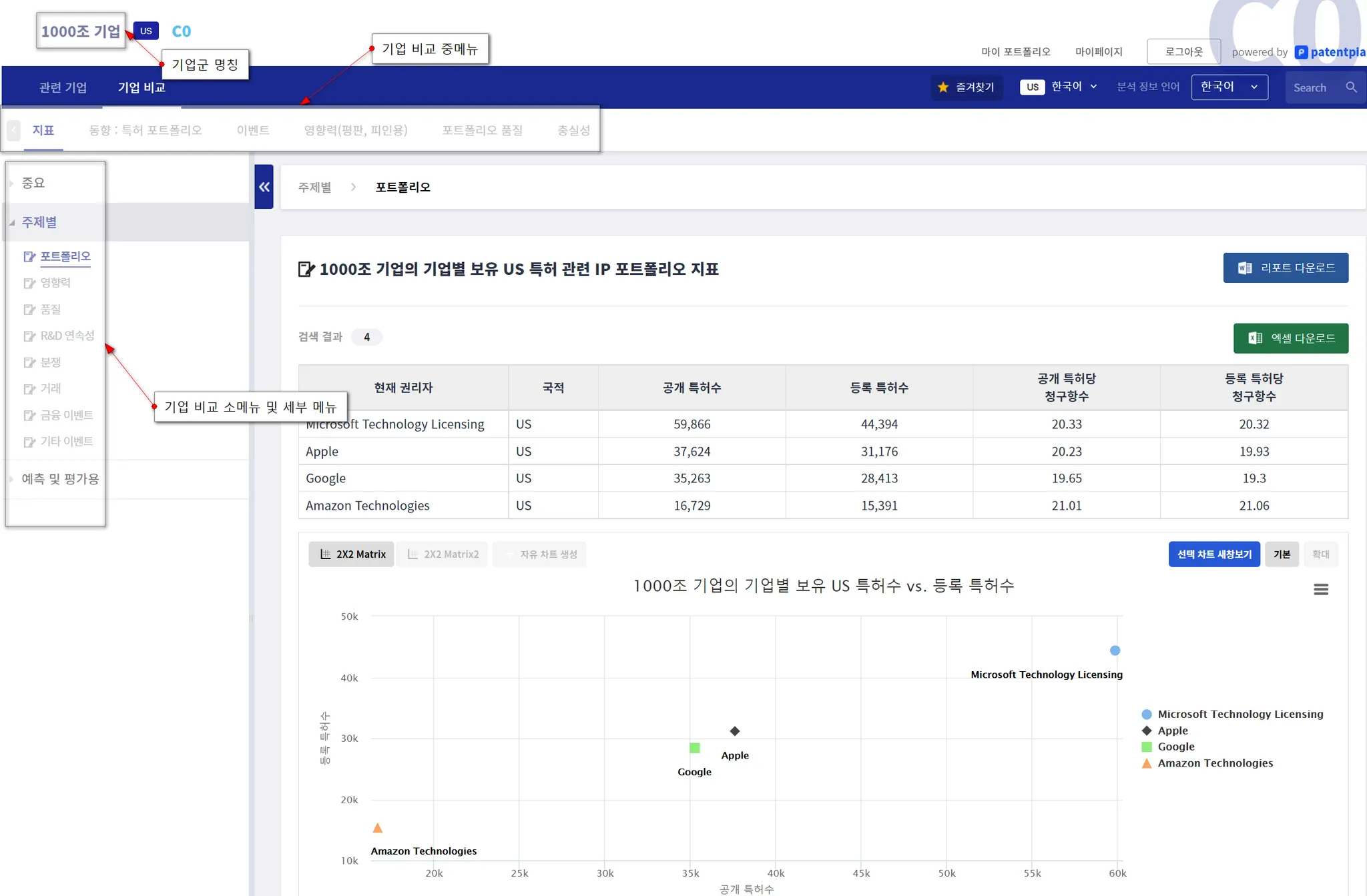 복수 개 기업군에 속하는 기업 간의 비교 분석 콘텐츠에는 i) 지표, ii) 특허 포트폴리오, iii) 영향력, iv) 충실성, v) 특허 품질, vi) 이벤트 등이 있습니다.