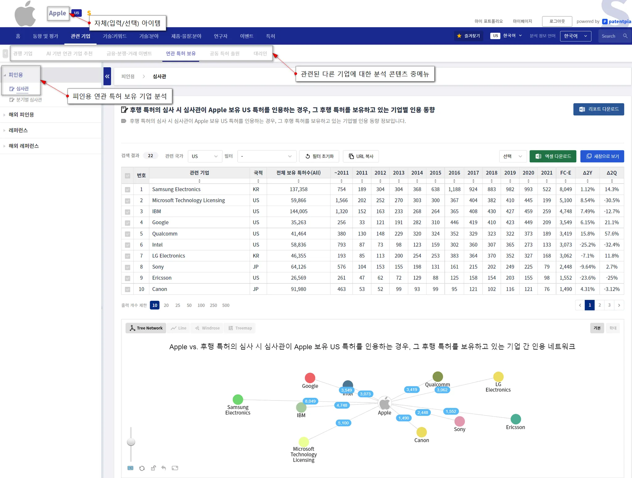 Apple을 관심 기업의 예시로 선정하여 PatentPia GoldenCompass를 활용한 연관 기업 분석 콘텐츠를 제공합니다. 위 활용 지도의 각 항목에 결합되어 있는 사슬(링크) 표시를 클릭하면, 예시 화면이 새 창으로 열립니다.