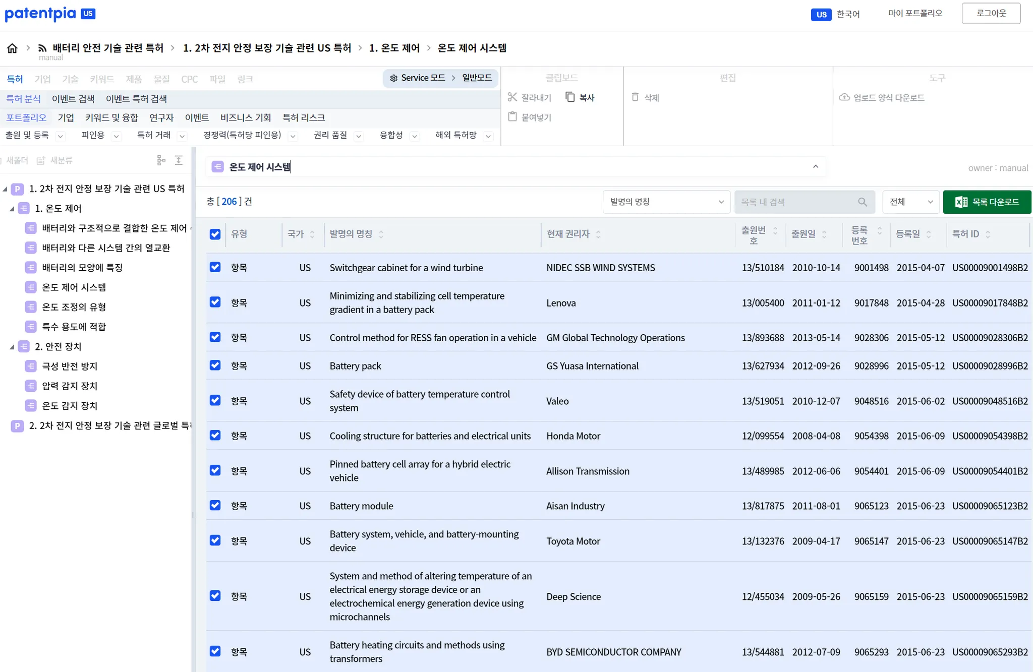 2차 전지 배터리 안전 관련 US 특허 리스트를 My platform에 업로드한 결과로 My platform의 관리 기능을 설명합니다.