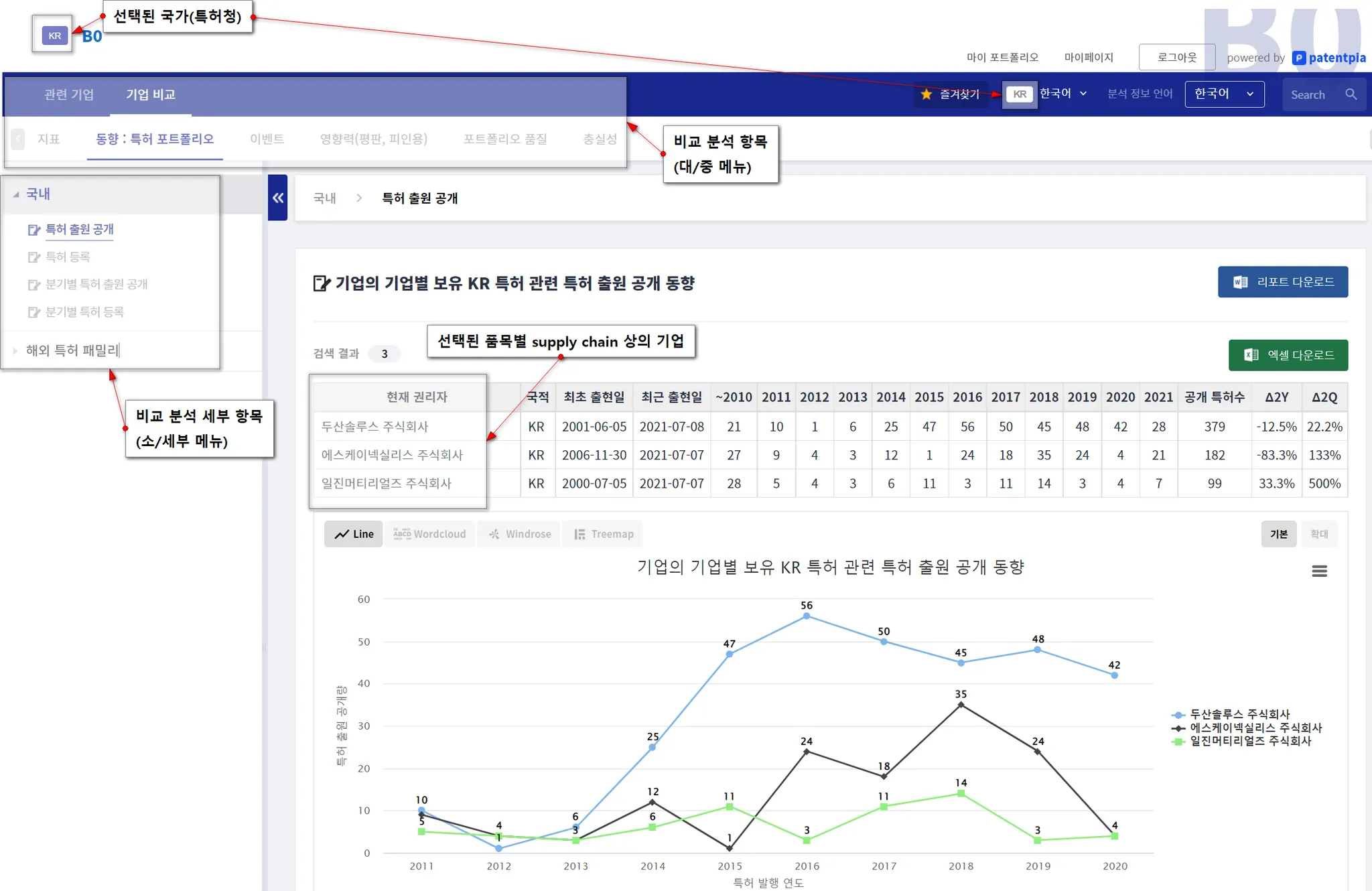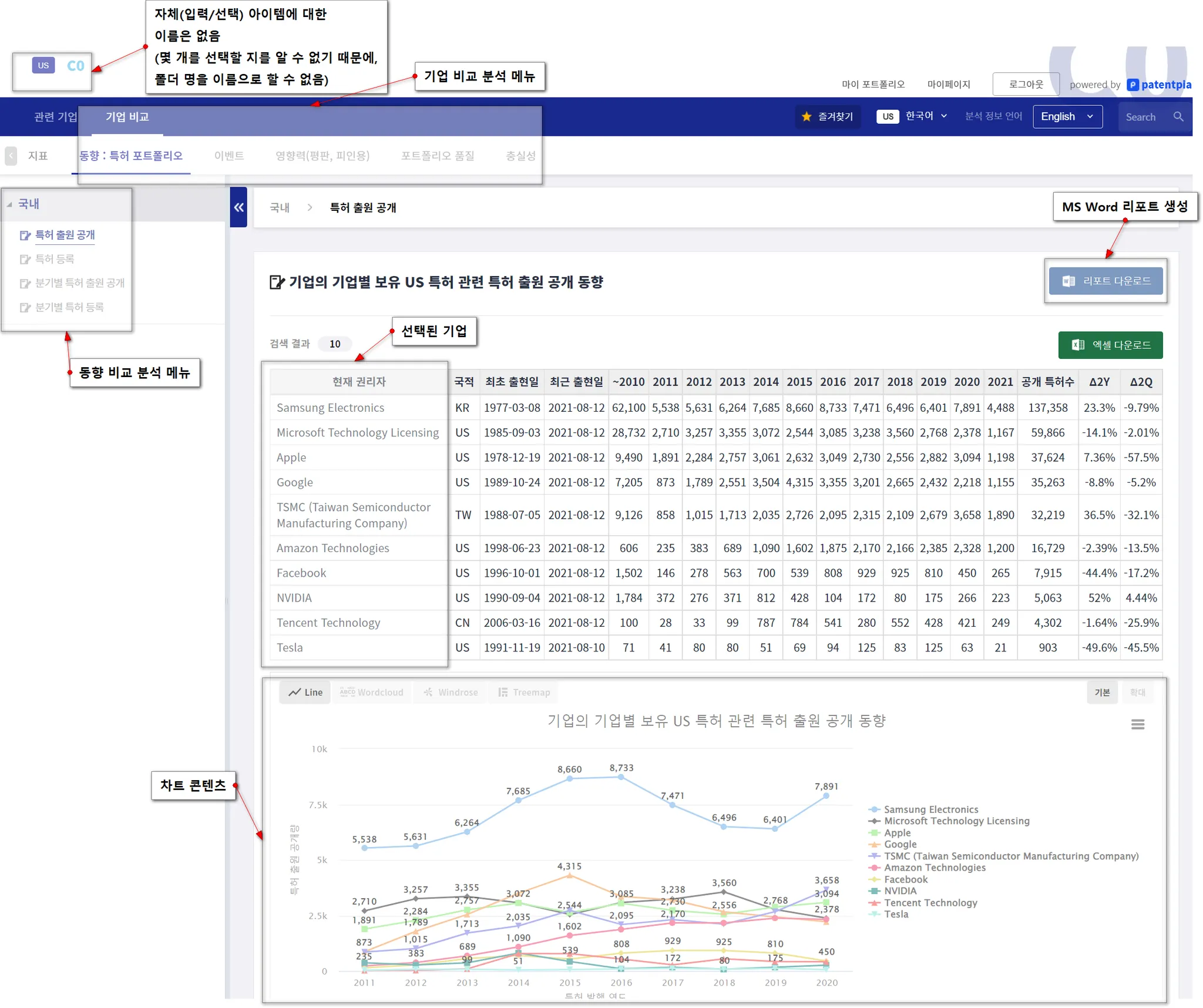 기업 비교 분석 콘텐츠는 기업 단위로 생성됩니다. 즉, 기업의 품목이나 기술 분야 등의 단위로 생성되지 않습니다. 품목별로의 기업의 등록은 기업의 등록일 뿐입니다. 즉, 데이터 처리의 대상이 되는 것은 기업 그 자체 입니다. 따라서, 특정 국가에서 기업이 보유하고 있는 전체 특허(not 그 품목의 특허)를 대상으로 분석합니다.