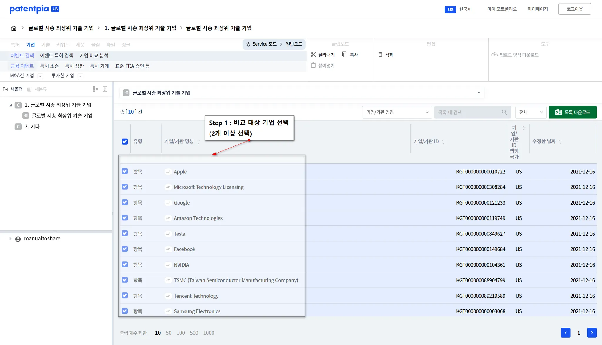 예시적으로 My Platform에서 글로벌 시가 총액 최상위 기술 기업 10개를 선택합니다.