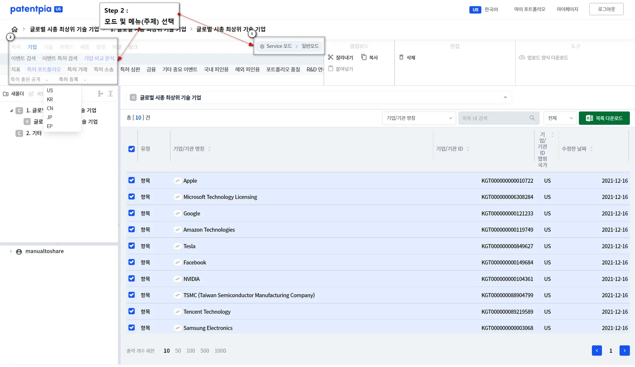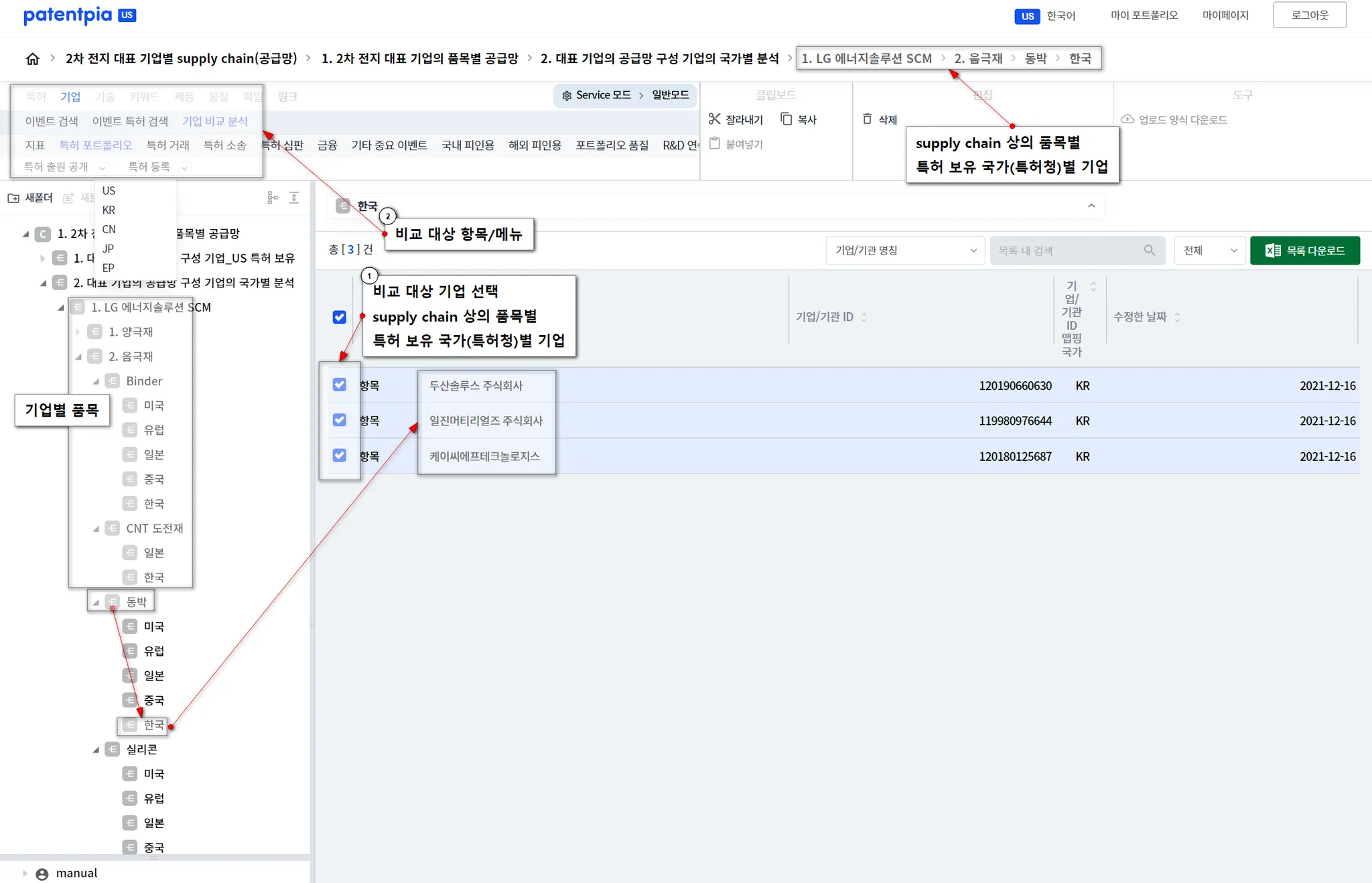 품목은 1~2 depth별로 세분화할 수 있습니다. 기업의 등록은 국가(특허청)별로 하는 것이, 국가(특허청)별로 supply chain 상의 기업의 특허를 분석하는데 도움이 됩니다.