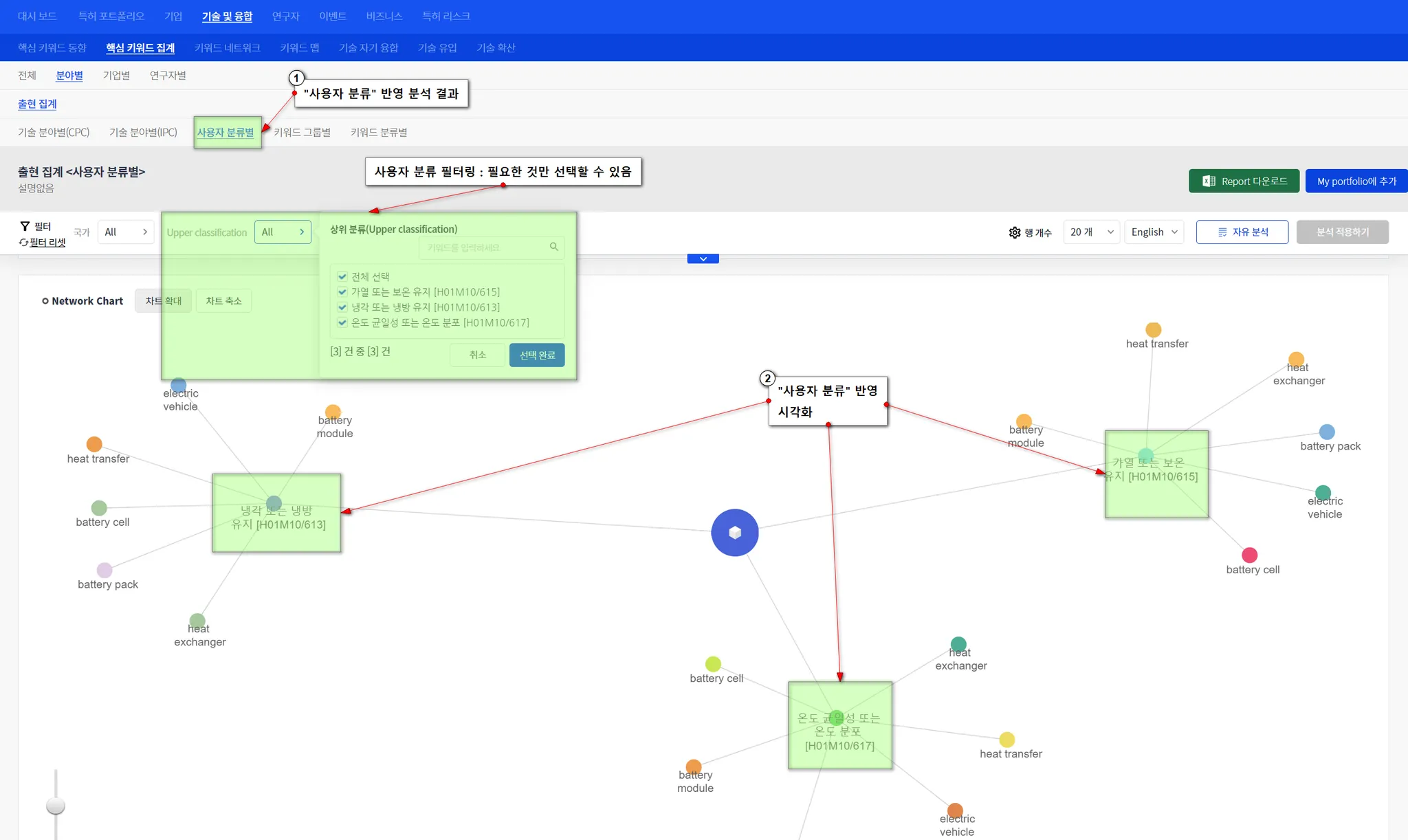특허 분석에 사용된 테크 트리/사용자 분류 중에서 필요한 것만 선택(필터링)할 수 있습니다.