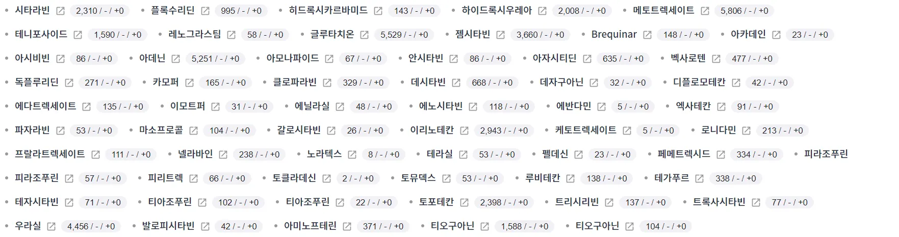 소재-물질 명칭 옆에 있는 아이콘을 클릭하면, 해당 소재-물질 명칭에 대응되는 각 국가별 소재-물질 분석 콘텐츠(max 2,000여종)가 제공됩니다.