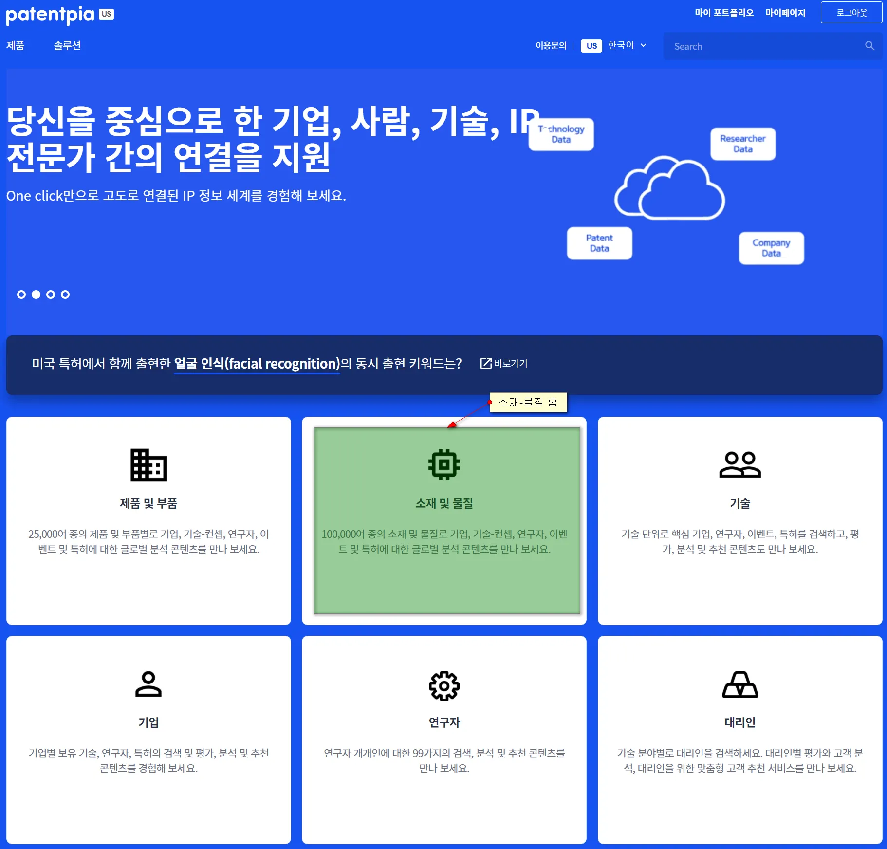소재-물질 홈은 PatentPia GoldenCompass main 화면에 있습니다.