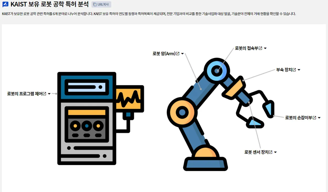 링크를 클릭하면 나타나는 웹 페이지에서 글자 부분(예, 로봇 암) 옆에 있는 아이콘(화살표가 있는 사각형이나, 역 화살표를 클릭하면, 세부적인 메뉴가 나타납니다. 메뉴(동향, 전문기업, 사업화 대상 특허, 거래 네트워크)를 클릭하면, 대응되는 콘텐츠/정보로 이동됩니다.