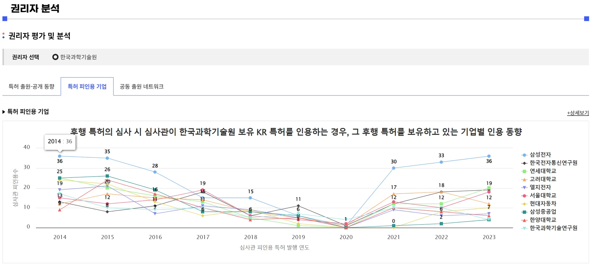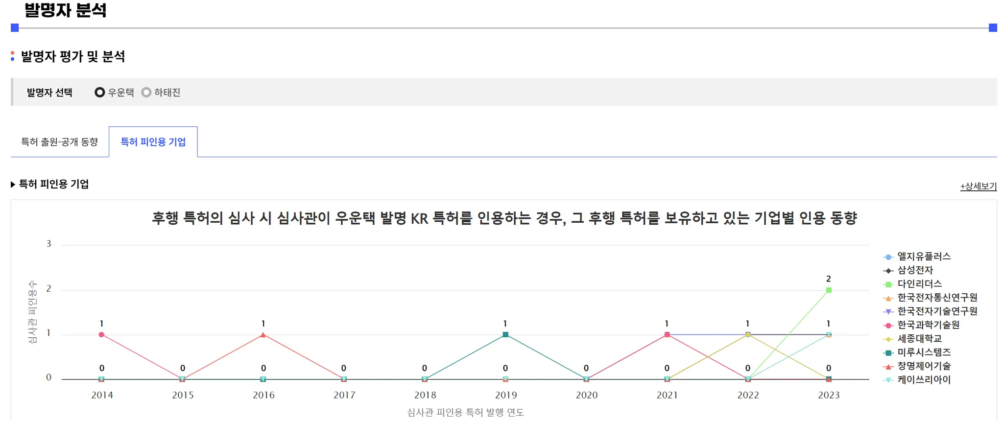 그리고, 그 특허를 보유하고 있는 대학/연구 기관에 대한 분석 정보뿐만 아니라, 그 특허를 발명한 발명자에게 대한 분석 정보(특히, 그 발명자의 발명을 인용하는 후행 특허 보유 기업이나, 그 발명자의 발명 특허때문에 거절된 후행 특허 보유 기업 등)이 필요합니다. 가장 중요한 이유는 이들 후행 특허 보유 기업 중에서. 자신의 경쟁사가 포함되어 있다면, 기술 이전의 가능성이 높아질 수 있기 때문입니다. 즉, 경쟁사가 포함되는 경우가 발생하면, 그 특허, 그 특허의 발명자와 자신과의 이해 관계의 민감도/강도가 크게 달라지기 때문입니다.