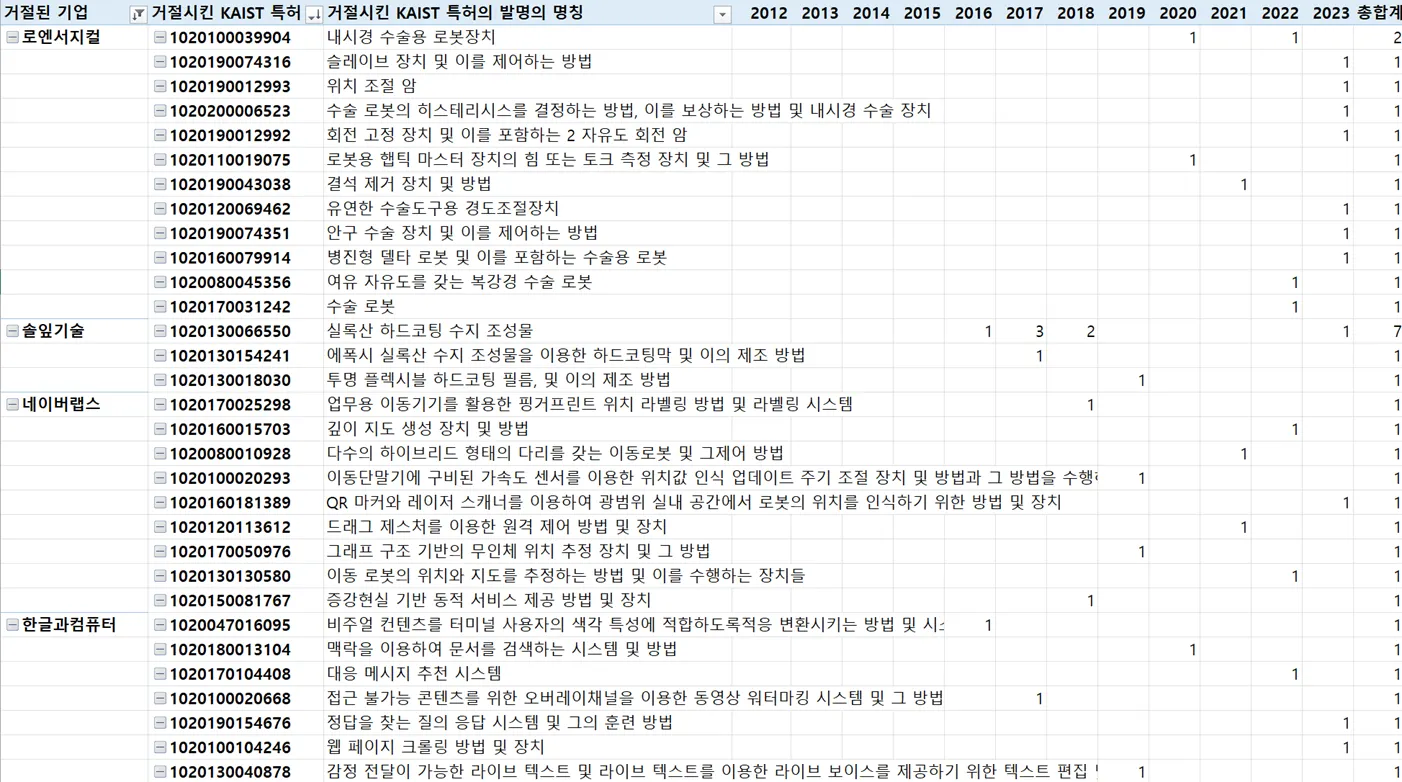 아래 예시는 KAIST 보유 대한민국 특허(약 17,000여건) 중에서, 특정 기업(예, 로엔서지컬, 솔잎기술, 네이버랩스 등)별로, 그 기업의 특허를 거절시키는데 사용된 KAIST 특허만을 모은 것입니다. 즉, KAIST 보유 17,000여 특허 중, 특정 기업i와 이해 관계(거절 관계)가 있는 특허는 극히 소수입니다. 이러한 극히 소소의 패키지화된 특허셋은 특정 기업i에게는 큰 의미(KAIST 선행 특허 때문에, 자신들의 출원 특허가 신규성이 없거나, 진보성이 없어 특허 등록이 저지되게 됨)를 가지게 됩니다.
