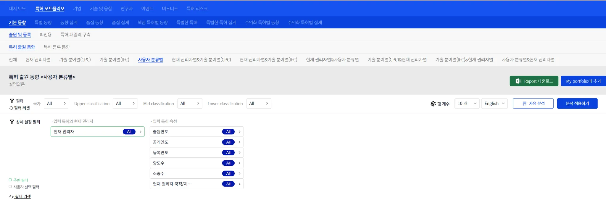 공통성 높은 메뉴로 (주로 4 depth 메뉴에 많이 나타나는), i) 전체, ii) 권리자별, iii) 기술 분야별, iv) 현재 권리자의 기술 분야별 등이 있습니다. 만약 주어진 특허셋에 “사용자 분류” 정보가 있다면, i) 사용자 분류별, ii) 현재 권리자의 사용자 분류별 메뉴가 더 나타납니다.