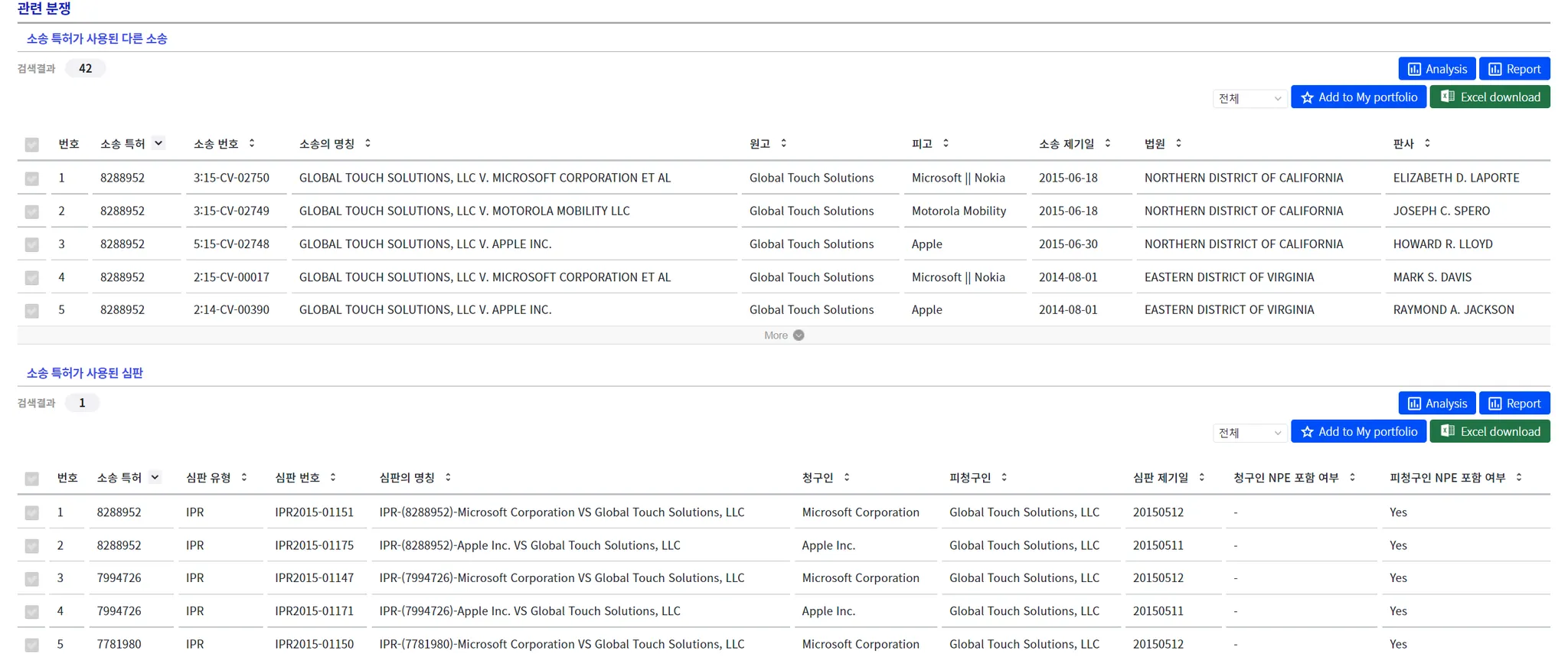 소송에 사용된 특허는 특허 아이템이 됩니다. 선택된 특허 아이템은 Analytics를 통하여 실시간 특허 분석을 할 수 있습니다. 그리고, My 포트폴리오의 특허 폴더에 등록할 수도 있습니다.