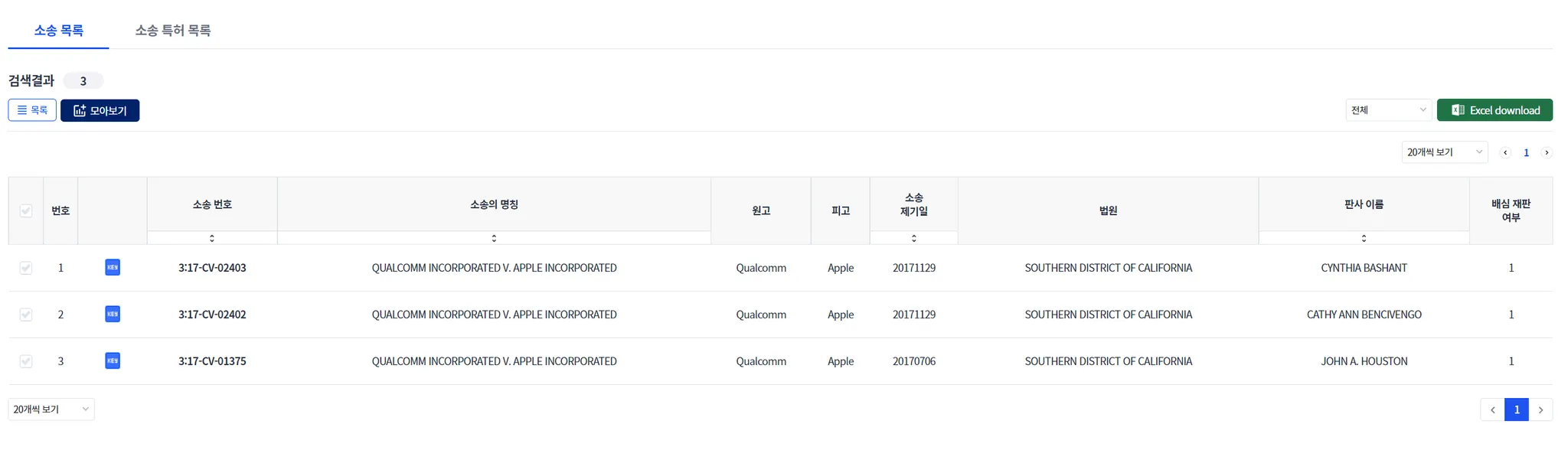 “소송 특허 목록”을 클릭하면, 검색된 1개 이상의 소송에 사용된 소송 특허를 모아서 출력해 줍니다.