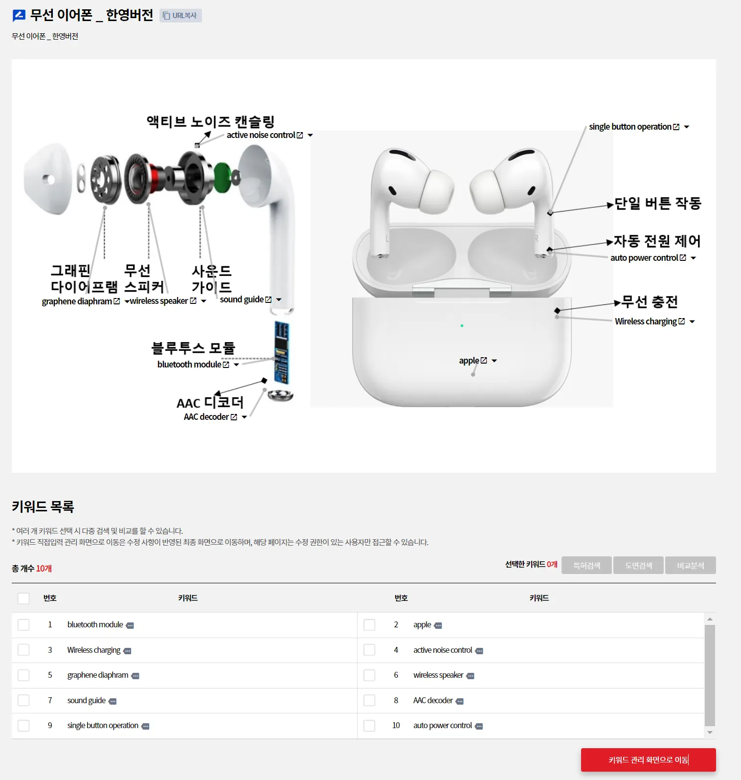 Apple의 무선 이어폰(에어팟)을 예시로,  PatentPia ImageMap을 활용 콘텐츠를 제공합니다. 위 활용 지도의 각 항목에 결합되어 있는 사슬(링크) 표시를 클릭하면, 예시 화면이 새 창으로 열립니다.