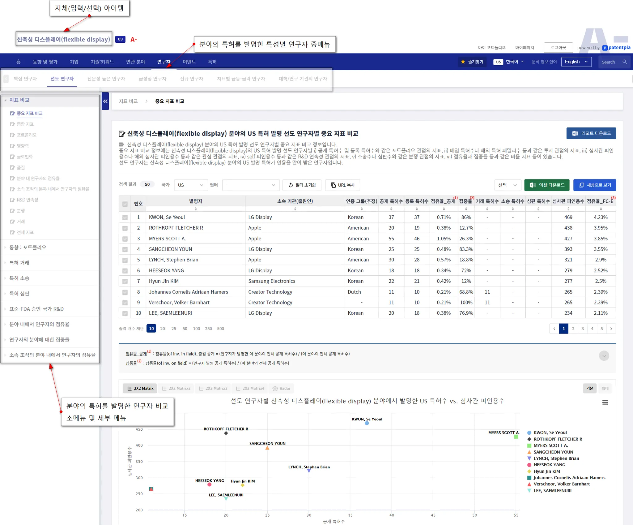GoldenCompass를 통하여 제공하는 Key researchers 분석 콘텐츠는 분야 내 특허 발명 연구자 간에서 비교 분석 콘텐츠입니다.