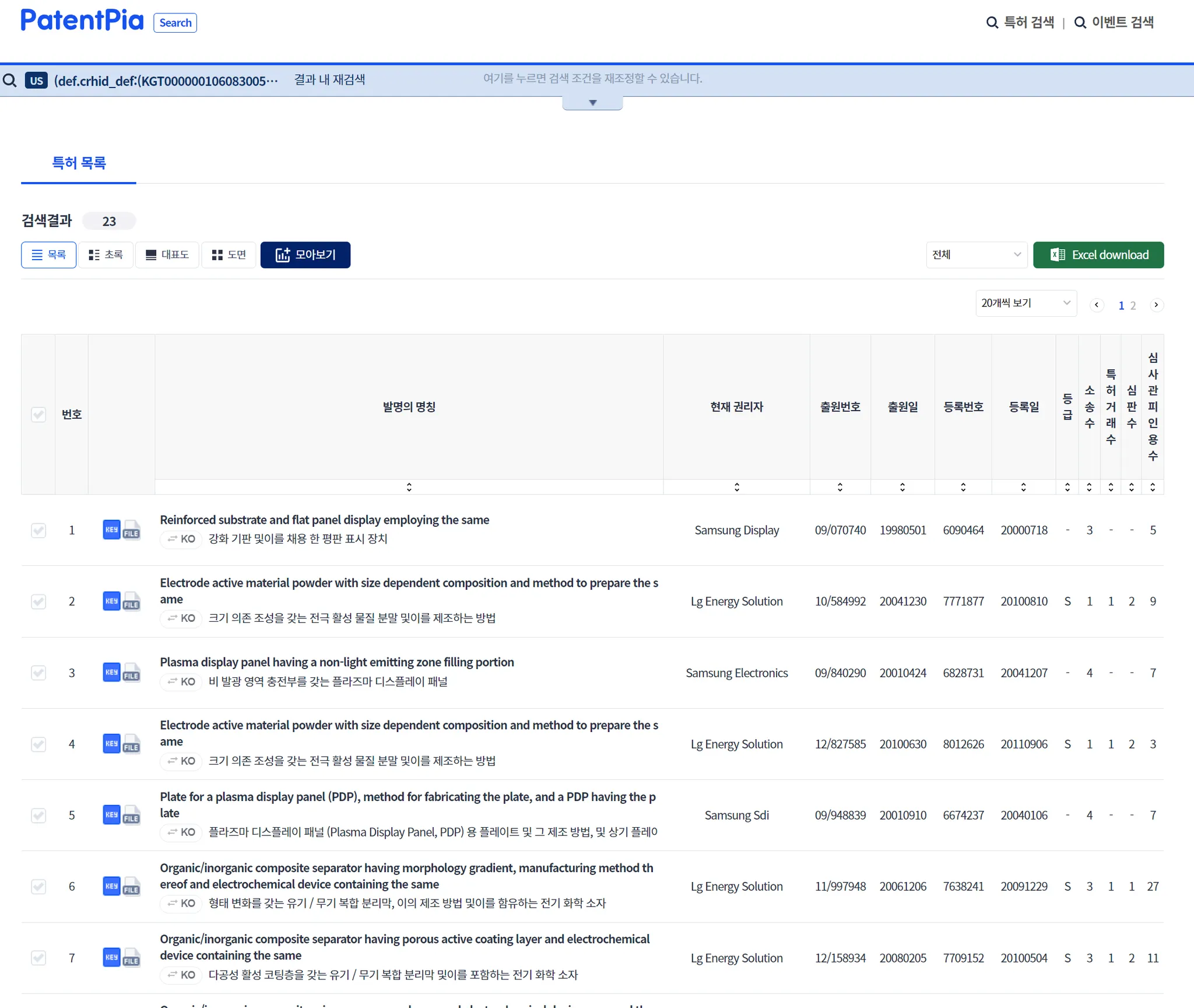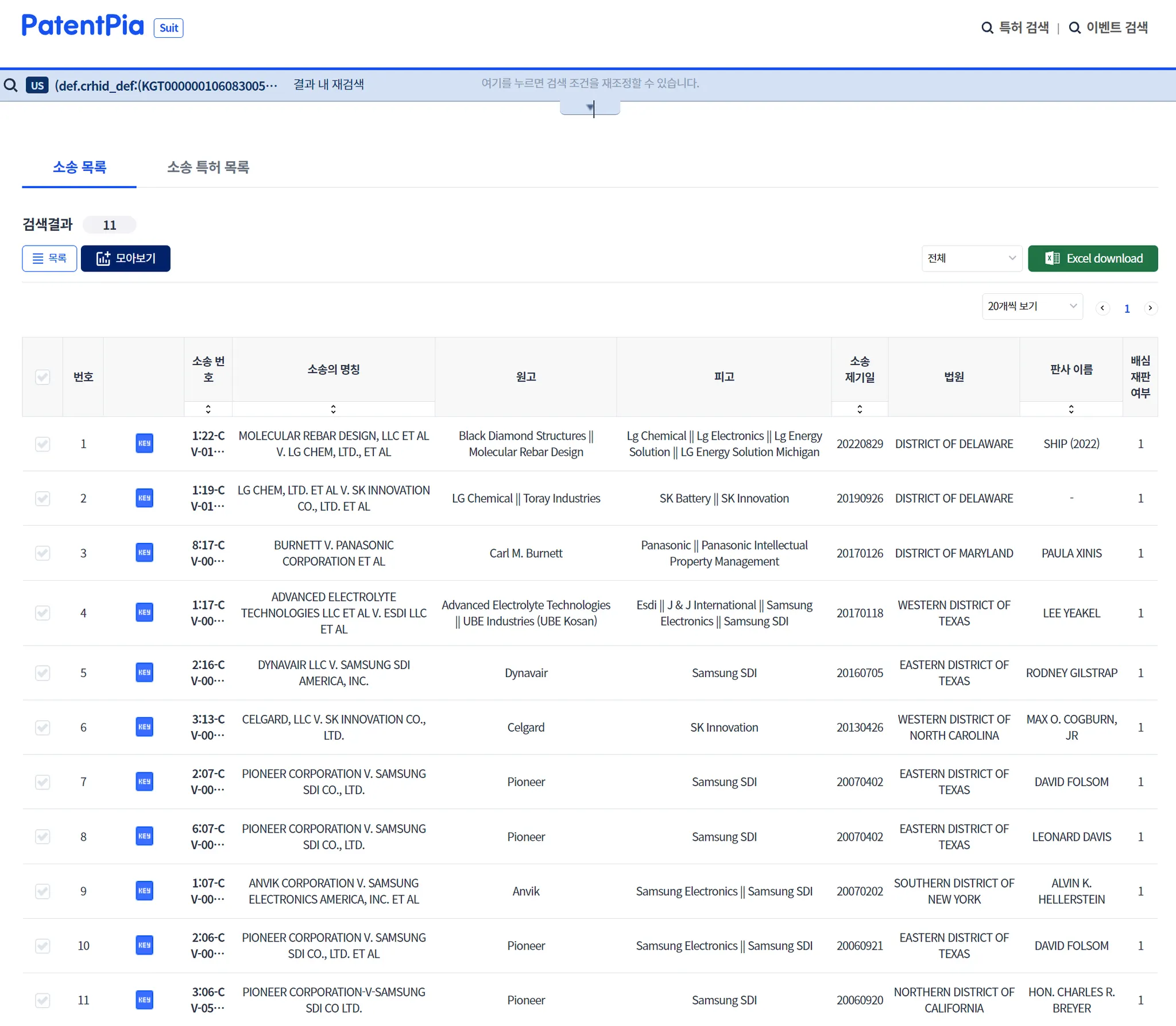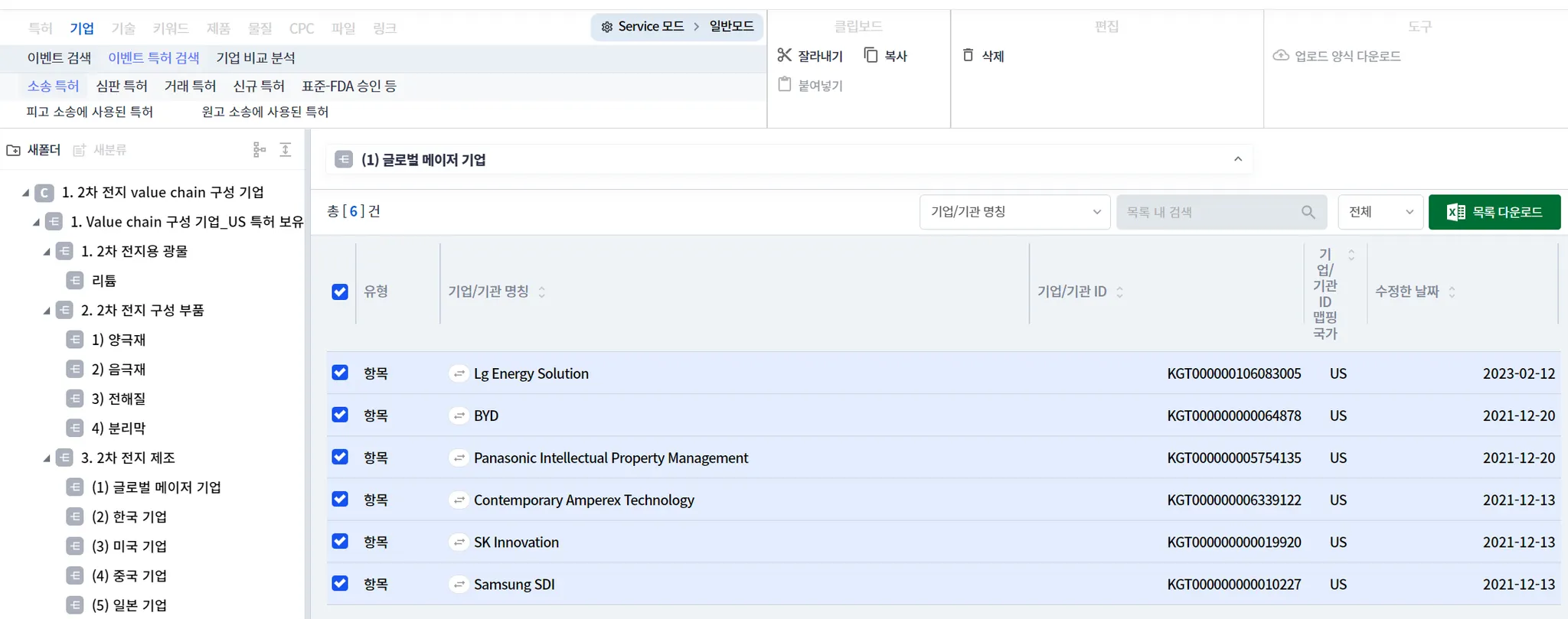My platform에서 선택된 기업 리스트를 PatentPia Search의 검색 조건으로 사용하는 i) 특허 소송, ii) 특허 심판, iii) 특허 거래 등과 같은 이벤트 검색 서비스가 제공됩니다. PatentPia Search의 이벤트 검색에 대한 상세한 내용은 [Link]를 참조하세요.