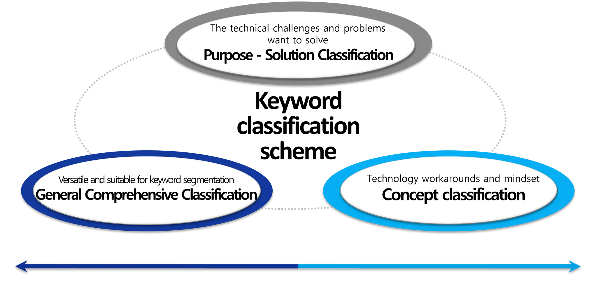 Keyword classifications include i) general comprehensive classification, ii) concept classification, and ii) purpose-solution classification (coming soon).