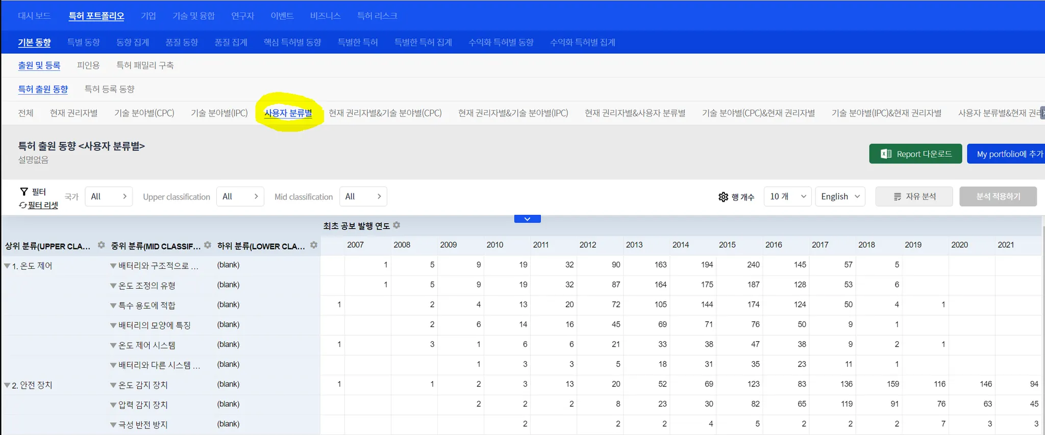 default로 생성된 특허 분석 결과에서, “사용자 분류별” 메뉴(최하단 메뉴인 ”전체” 기준 오른쪽으로 5번째 위치에 있음)를 선택합니다.