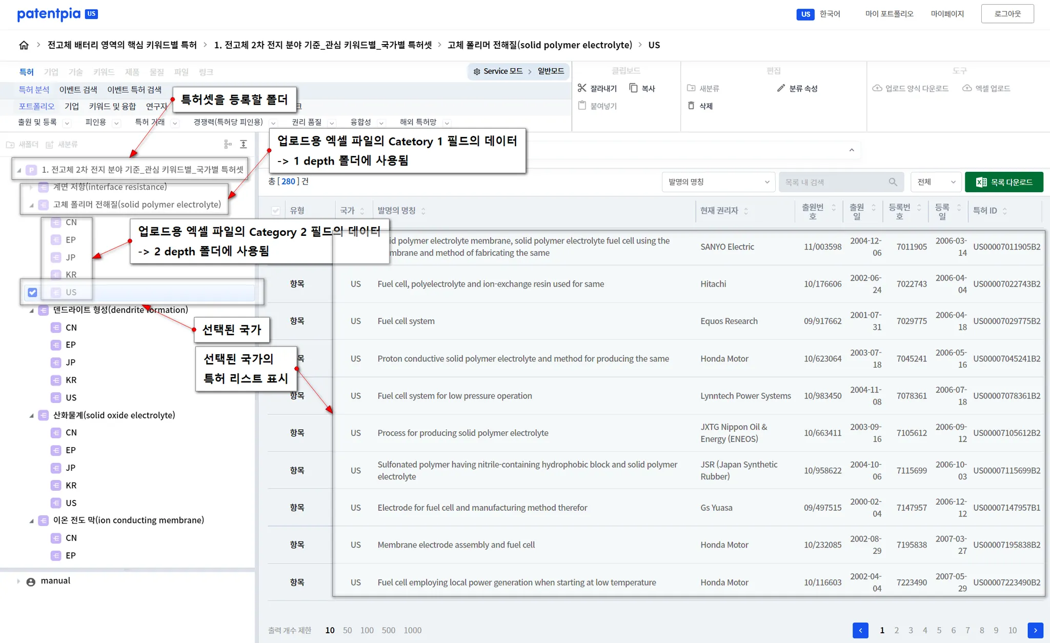 특허 분석을 실행할 때, 분석의 대상이 되는 분석 대상 특허셋을 지정해야 합니다. 분석 대상 특허셋은 특허 리스트에서 n개의 특허를 선택하여 진행할 수도 있습니다. 하지만, 몇몇개의 소수의 선택된 특허를 대상으로 하는 것이 아니라면, “폴더 구조창”에서 분석 대상 특허셋을 선택하는 것이 가장 편리합니다. “폴더 구조창”에서 분석 대상 특허셋을 선택하면, 계층(예, 테크 트리, 위 예시에는 “계면 저장”, “고체 폴리머 전해질” 등의 키워드) 정보가 반영된 특허 분석이 가능합니다.