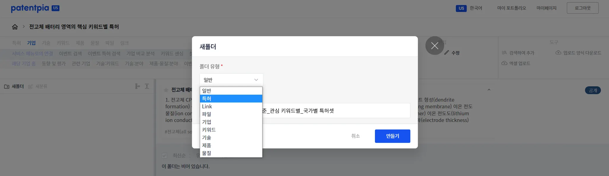 특허셋을 업로드 하기 전에 특허셋을 담을 공간인 폴더를 먼저 생성해야 합니다. 폴더 구조 영역의 좌측 맨 위에 있는 “새폴더” 아이콘을 클릭하고 폴더를 생성합니다.  특허셋을 담기 때문에 폴더 유형은 “특허”입니다. 폴더의 명칭(예, 1. 전고체 2차 전지 분야 기준_관심 키워드별_국가별 특허셋)을 입력합니다. 특허 폴더는 아이콘에 “P”가 포함되어 있습니다.