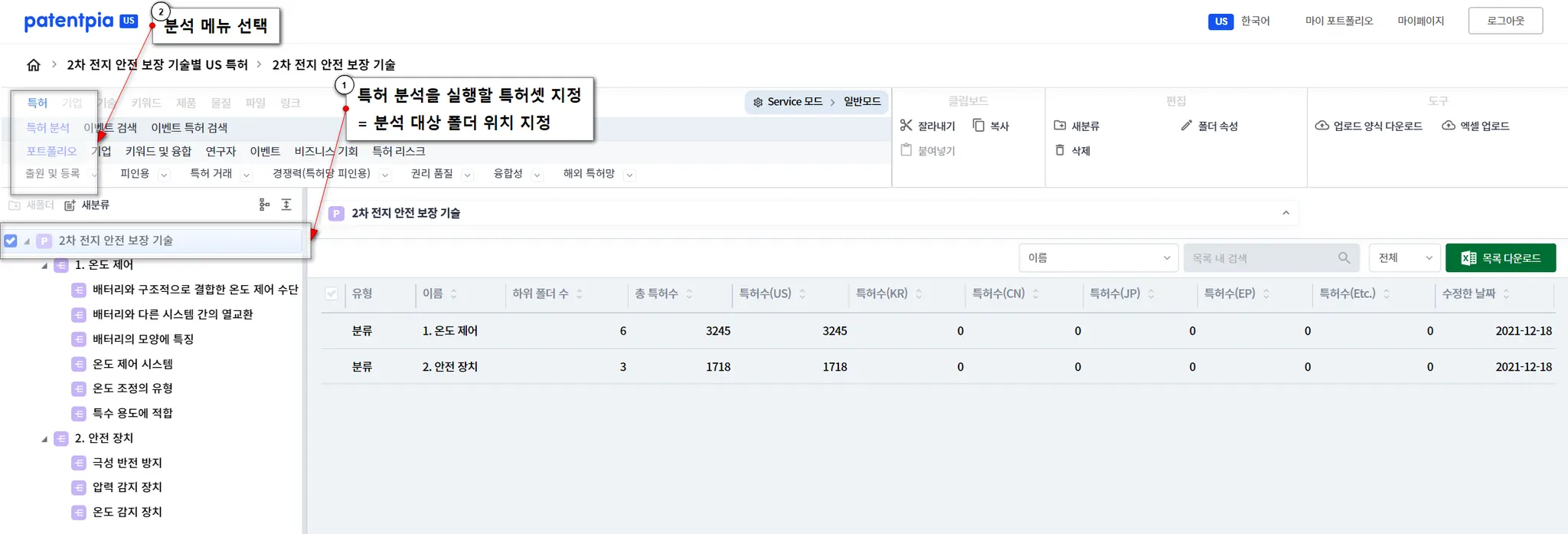 특허 분석 결과에 사용자 분류가 나타나게 할 필요가 있습니다. 이를 위해서는 특허 분석을 실행할 특허셋을 지정할 때, 폴더 영역에서 원하는 폴더를 지정해야 합니다.