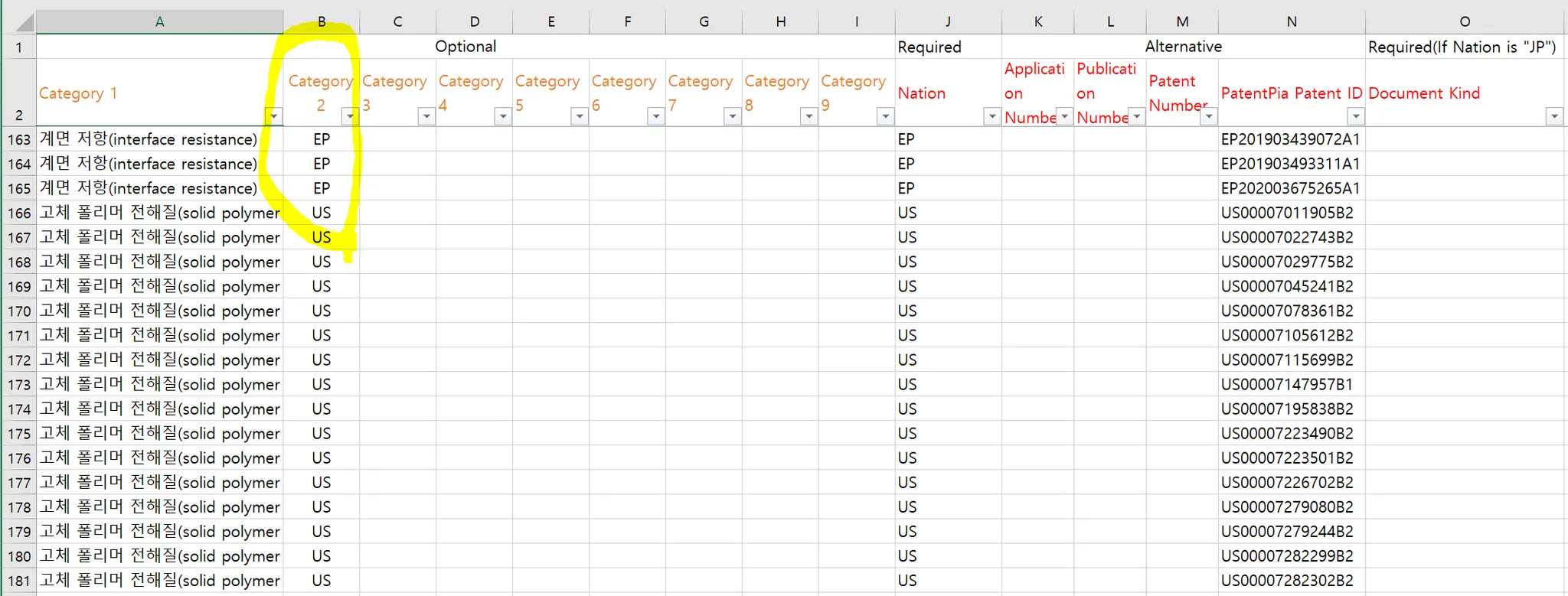 업로드용 엑셀 양식 파일에는 선택적 입력 필드인  i) Category 1~Category 9 필드, 필수 입력 필드인 ii) 국가(특허청)  및 iii) 특허 번호 등이 있습니다.