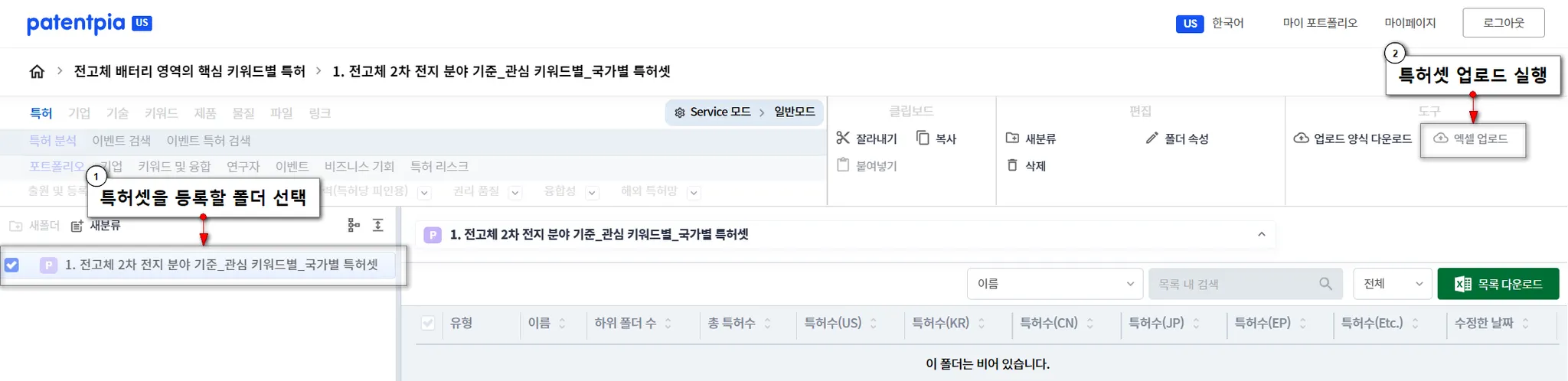 생성한 특허 폴더를 선택하고, 메뉴 영역에서 “엑셀 업로드” 메뉴를 클릭합니다.