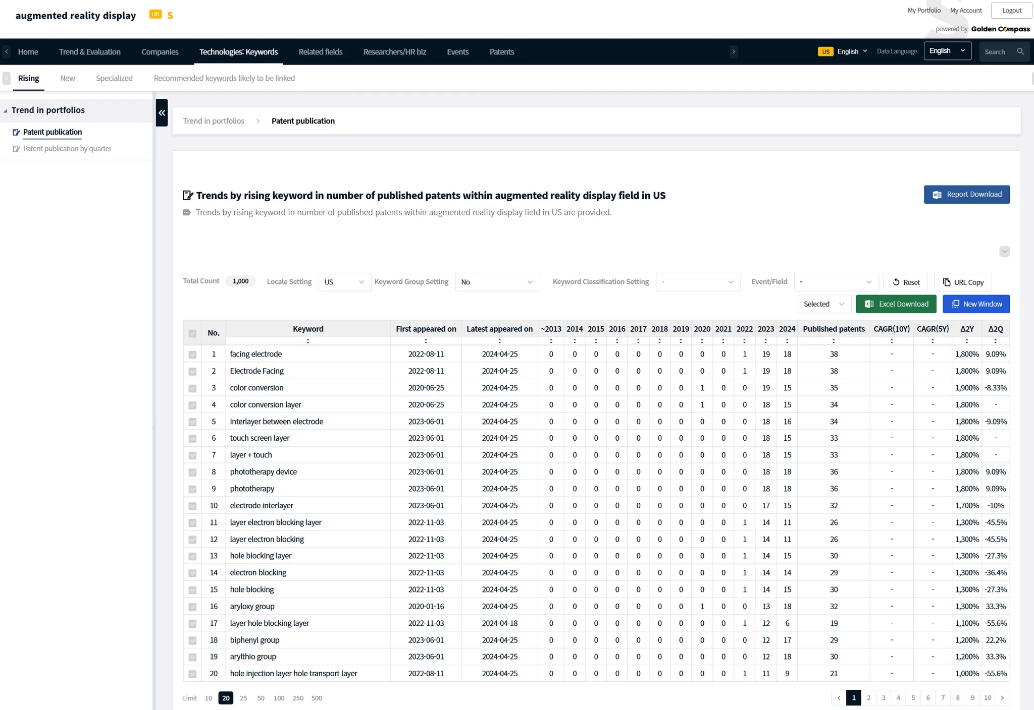 In PatentPia GoldenCompass, if you change the 'data language setting' to KO, in English keywords, English-Korean keyword translations appear.