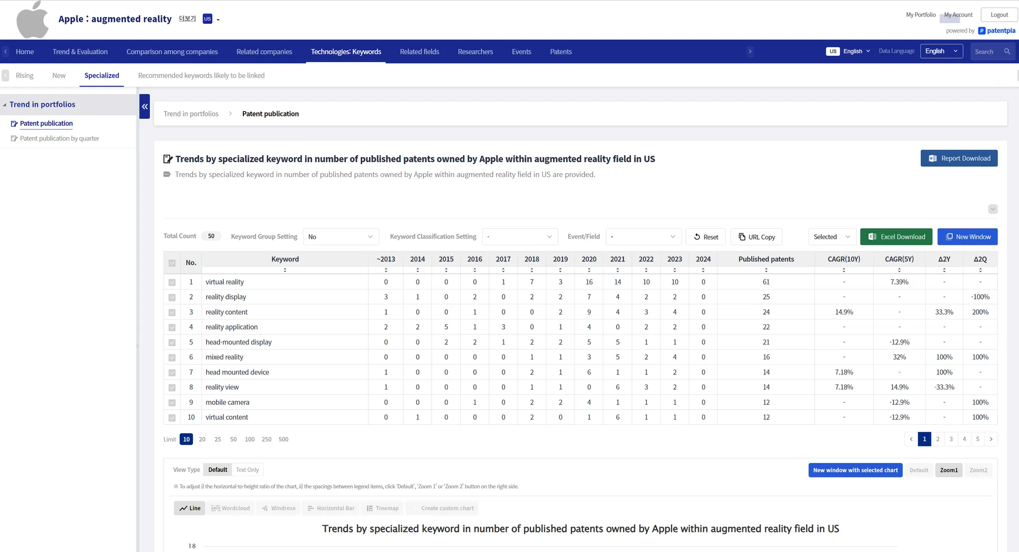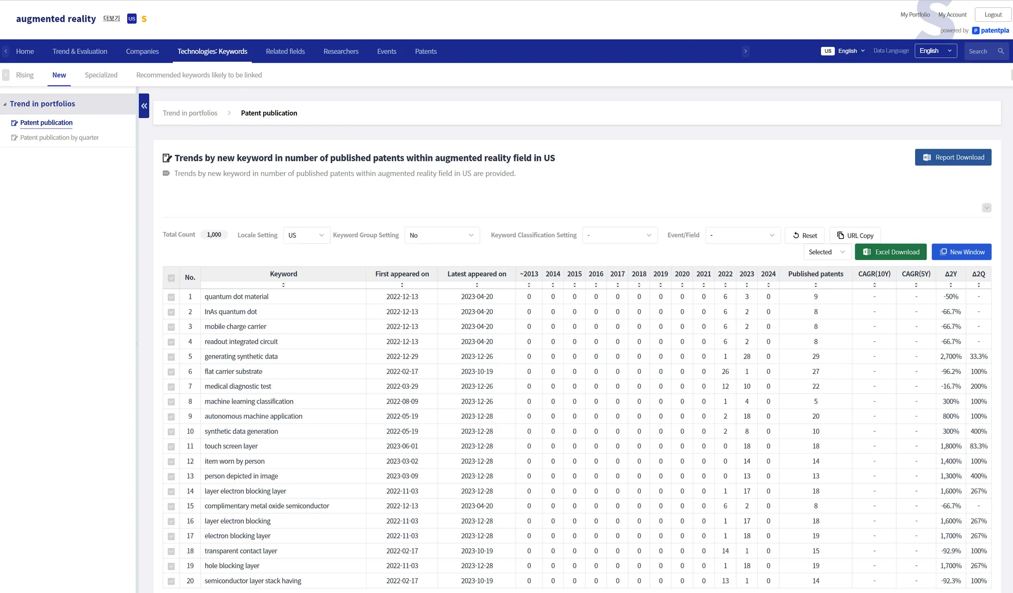 Below is an example of new appearing keyword contents based on US patents for the keyword item "augmented reality" provided by GoldenCompass. For a list of new appearing keywords, you can also get a confined or refined list of rapidly growing keywords by filtering the classification to "goods and parts," for example.