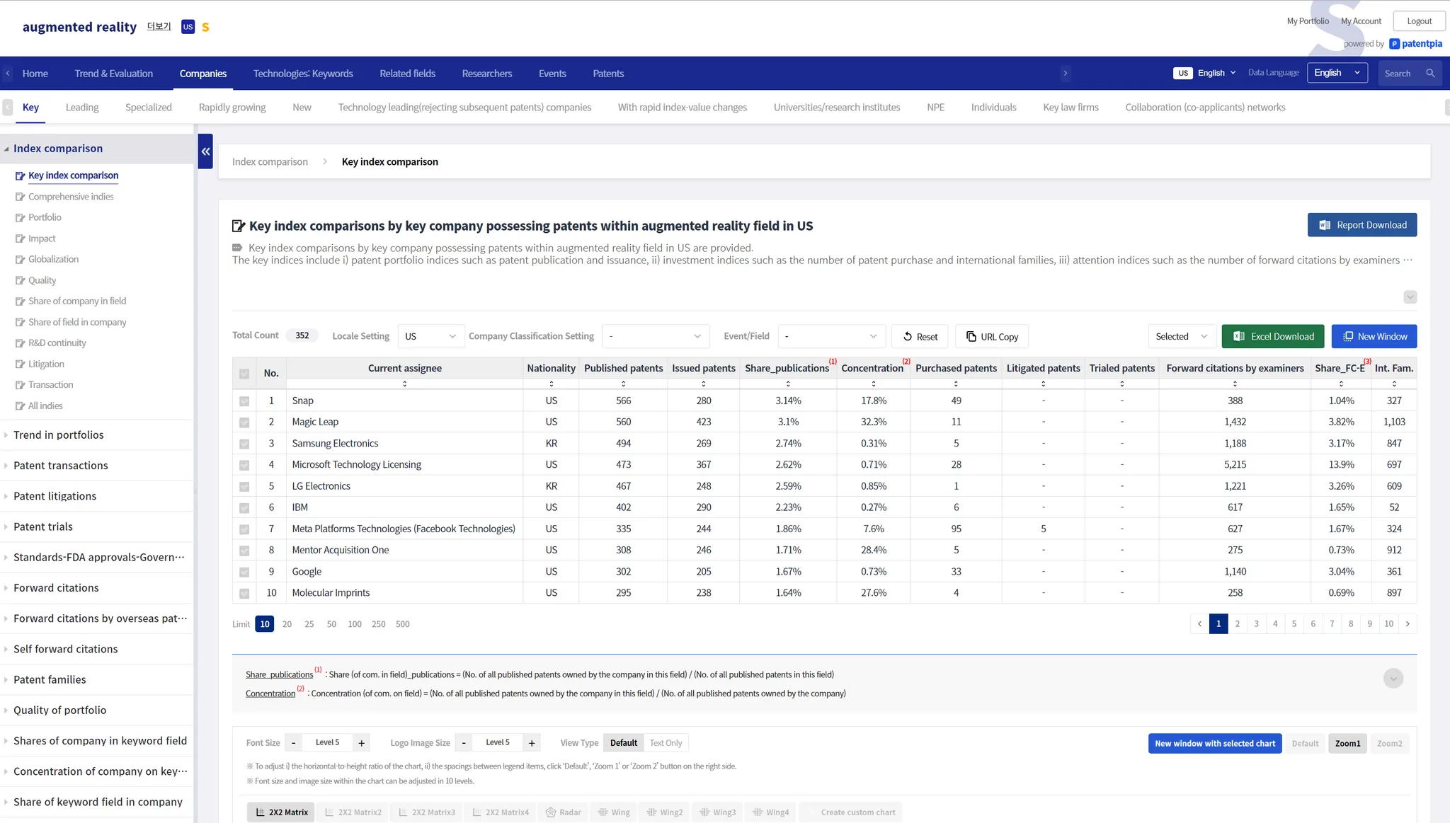 Below is an example of company analysis contents for the keyword item "augmented reality". The companies in the analysis are right holders of patents for "augmented reality." You can analyze comparisons between right holders of patents. The types of comparative analysis are: i) index comparison, ii) trend comparison, iii) forward citations comparison, iv) patent families comparison, v) quality comparison, vi) comparison by kind of events, vii) share comparison, and viii) concentration comparison.