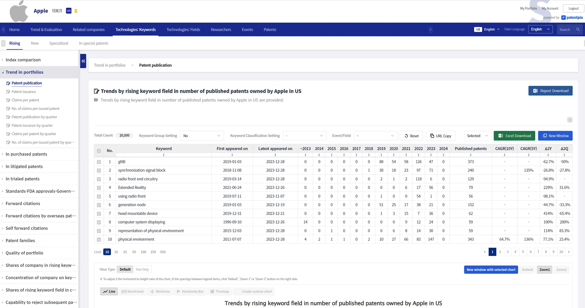 Below is an example of the rapidly growing keywords contents by US patents for the company item "Apple" provided by GoldenCompass. For the list of rapidly growing keywords, you can also apply descending sorting to the "first day of appearance" field, filter by "goods and parts" for the classification, etc. to get a confined or refined list of rapidly growing keywords.
