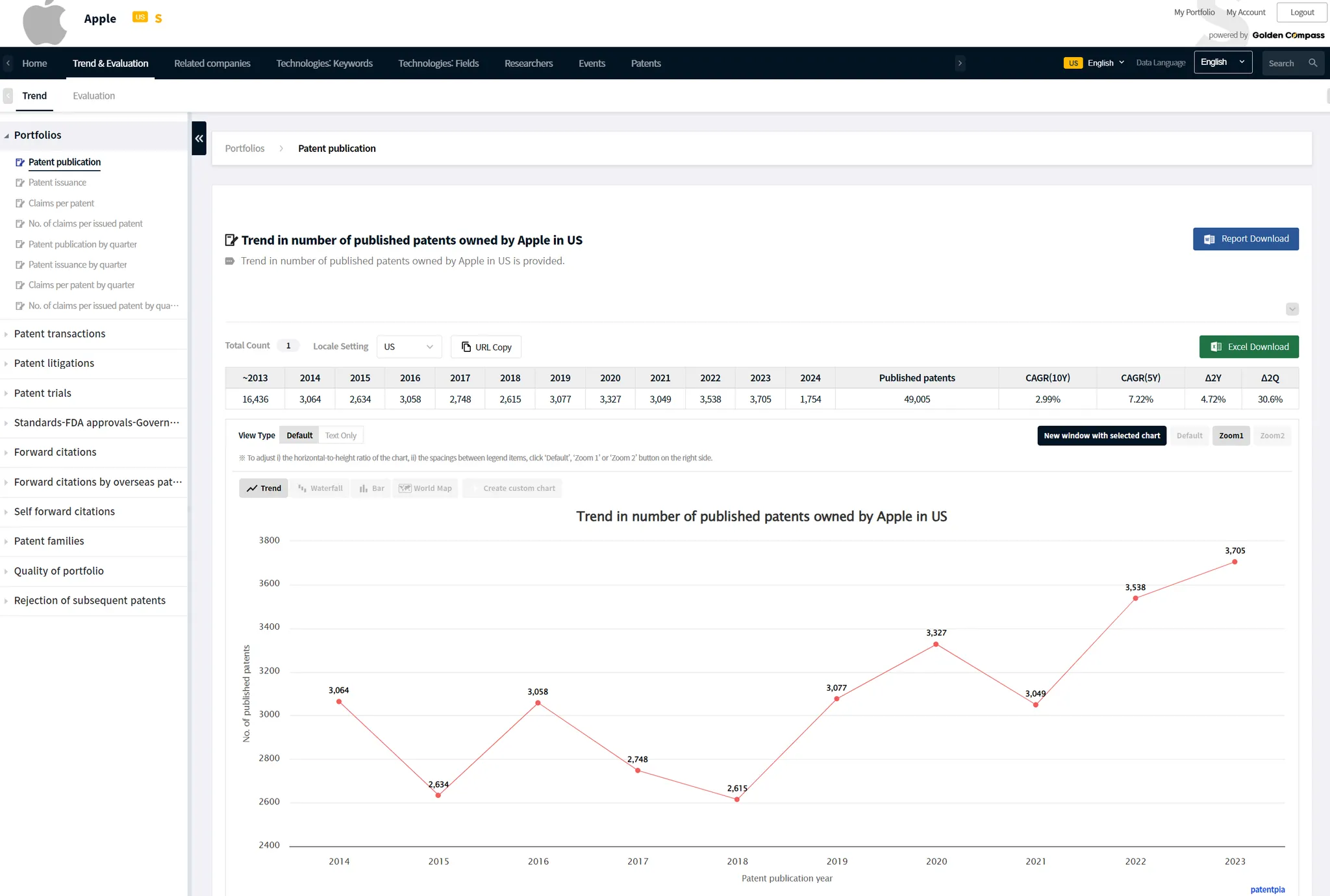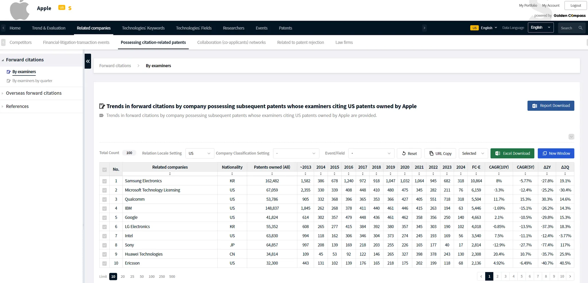 GoldenCompass provides analytical contents such as i) various trends, ii) various keywords included in the patents, iii) various fields related to the patents (technology, product/parts, materials/substances, etc.), iv) researchers who invented the patents, v) events related to the company or patents in possession, vi) patents, etc. for all (open and issued) patents held by the company in a particular nation.