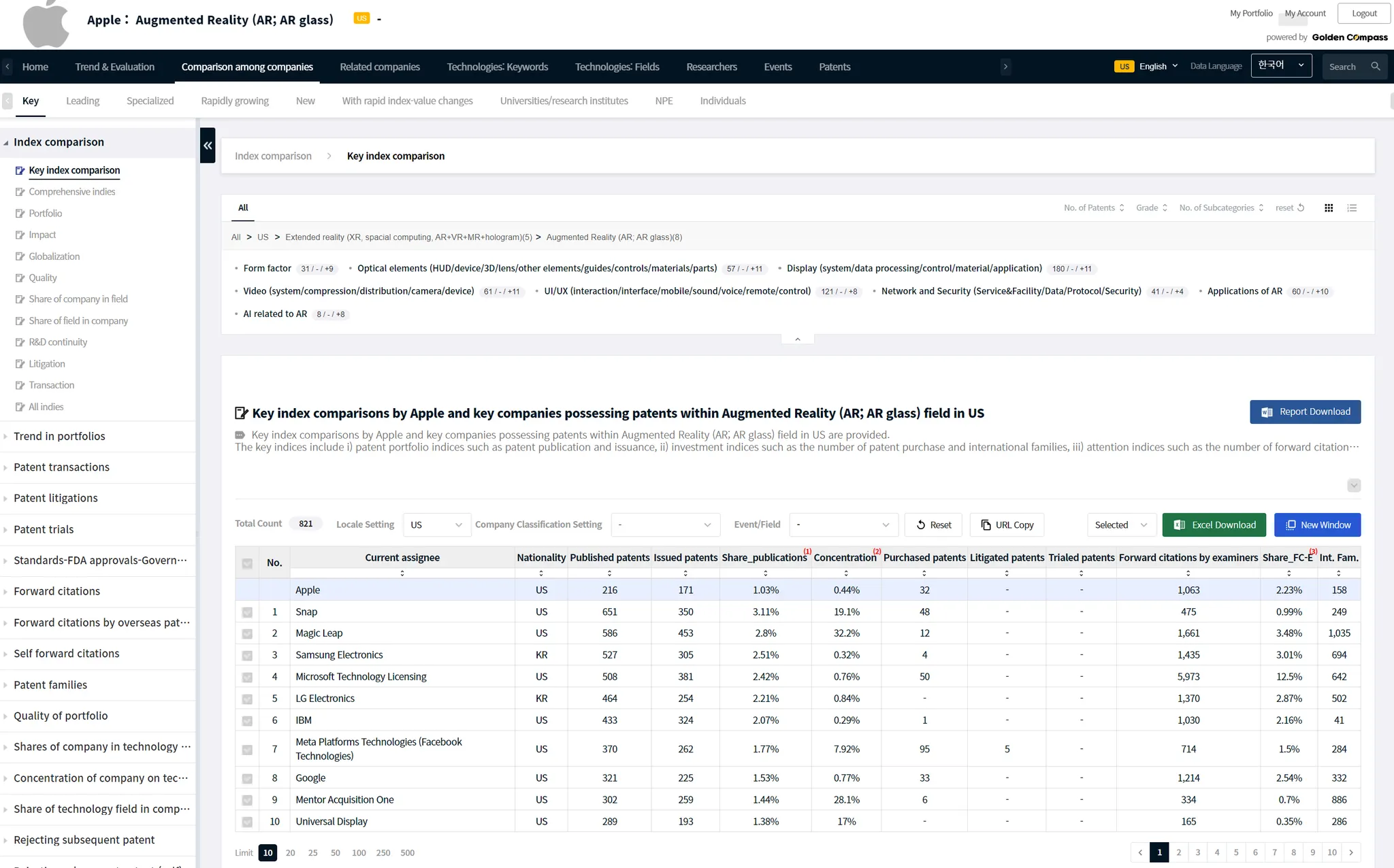 GoldenCompass provides comparison analysis contents among companies with patents in possession in a field.